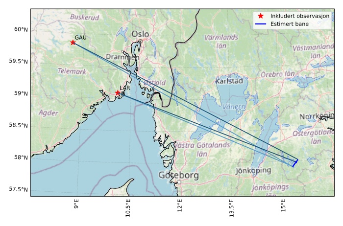 Kartet viser peilingene for meteoren. De lysere linjene viser retningene fra observasjonsstedene for meteorens tilsynekomst, og de mørkere linjene viser hvor den sist kunne sees. Den blå pila viser meteorens synlige ferd.