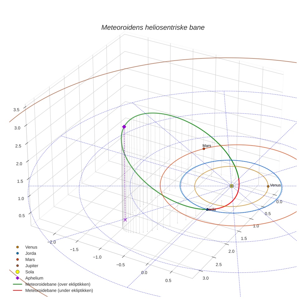 Plottet under viser meteoridens bane i solsystemet. Grønn del av banen ligger over ekliptikken og rød del under.