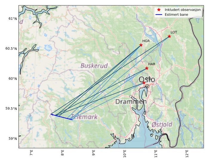 Kartet viser peilingene for meteoren. De lysere linjene viser retningene fra observasjonsstedene for meteorens tilsynekomst, og de mørkere linjene viser hvor den sist kunne sees. Den blå pila viser meteorens synlige ferd.