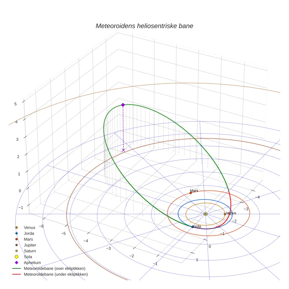Plottet under viser meteoridens bane i solsystemet. Grønn del av banen ligger over ekliptikken og rød del under.