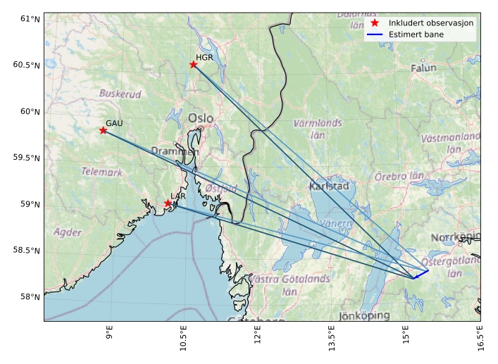 Kartet viser peilingene for meteoren. De lysere linjene viser retningene fra observasjonsstedene for meteorens tilsynekomst, og de mørkere linjene viser hvor den sist kunne sees. Den blå pila viser meteorens synlige ferd.