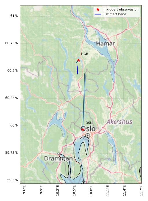 Kartet viser peilingene for meteoren. De lysere linjene viser retningene fra observasjonsstedene for meteorens tilsynekomst, og de mørkere linjene viser hvor den sist kunne sees. Den blå pila viser meteorens synlige ferd.