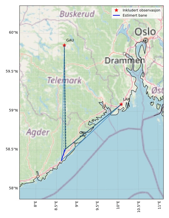 Kartet viser peilingene for meteoren. De lysere linjene viser retningene fra observasjonsstedene for meteorens tilsynekomst, og de mørkere linjene viser hvor den sist kunne sees. Den blå pila viser meteorens synlige ferd.