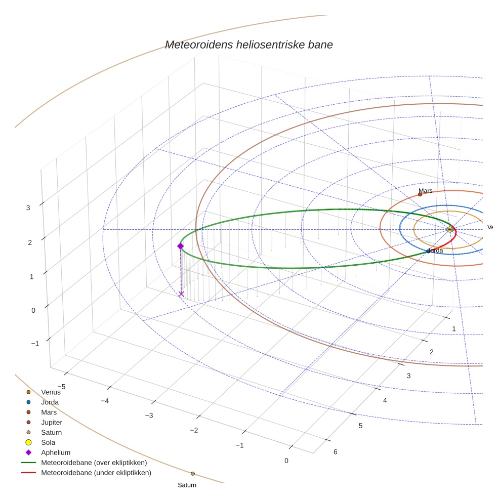 Plottet under viser meteoridens bane i solsystemet. Grønn del av banen ligger over ekliptikken og rød del under.