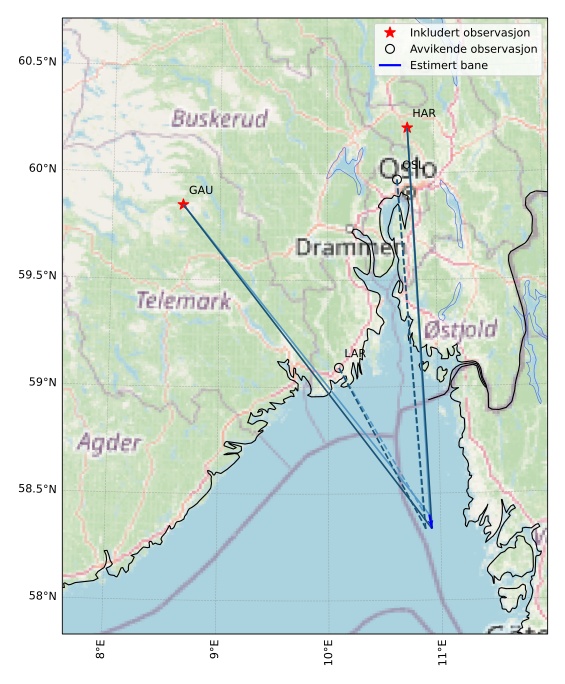 Kartet viser peilingene for meteoren. De lysere linjene viser retningene fra observasjonsstedene for meteorens tilsynekomst, og de mørkere linjene viser hvor den sist kunne sees. Den blå pila viser meteorens synlige ferd.