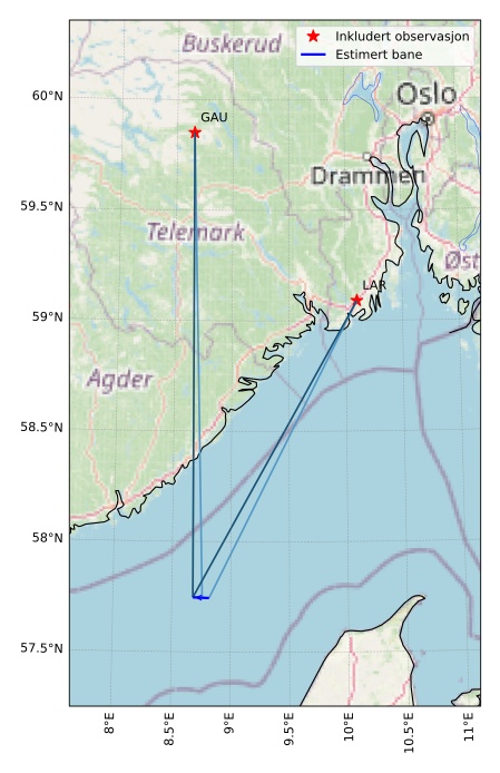 Kartet viser peilingene for meteoren. De lysere linjene viser retningene fra observasjonsstedene for meteorens tilsynekomst, og de mørkere linjene viser hvor den sist kunne sees. Den blå pila viser meteorens synlige ferd.