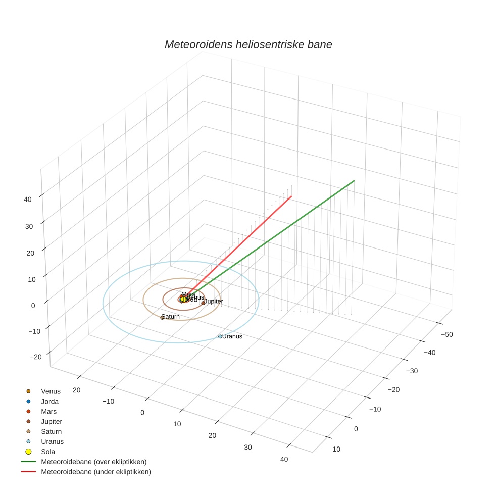 Plottet under viser meteoridens bane i solsystemet. Grønn del av banen ligger over ekliptikken og rød del under.