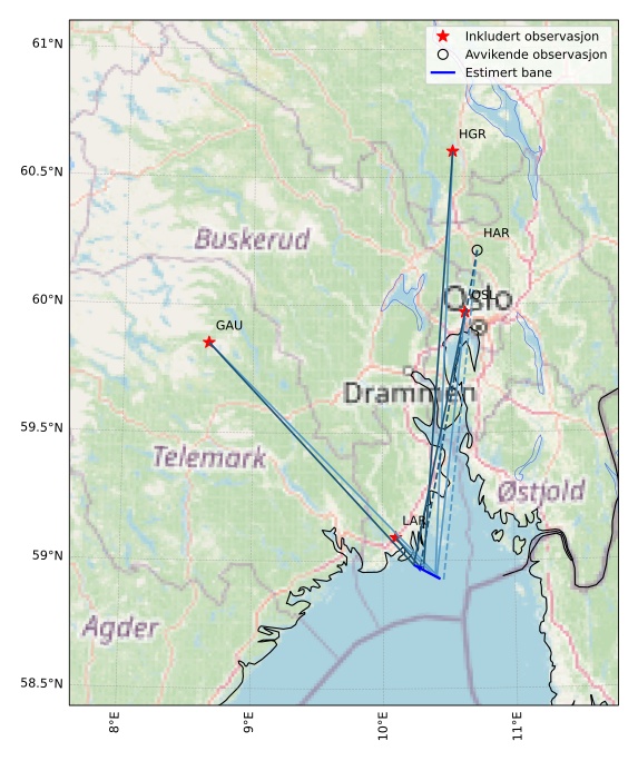 Kartet viser peilingene for meteoren. De lysere linjene viser retningene fra observasjonsstedene for meteorens tilsynekomst, og de mørkere linjene viser hvor den sist kunne sees. Den blå pila viser meteorens synlige ferd.