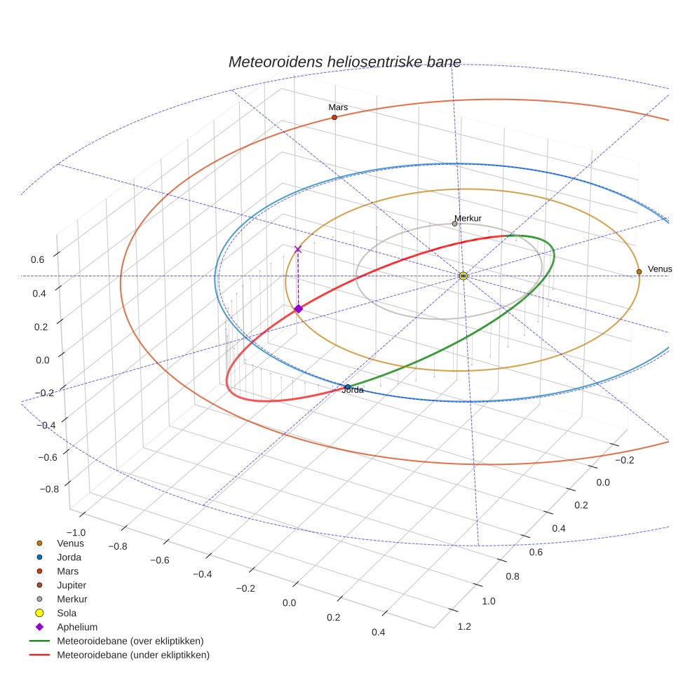 Plottet under viser meteoridens bane i solsystemet. Grønn del av banen ligger over ekliptikken og rød del under.
