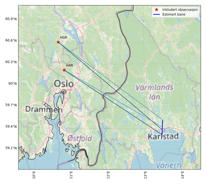 Kartet viser peilingene for meteoren. De lysere linjene viser retningene fra observasjonsstedene for meteorens tilsynekomst, og de mørkere linjene viser hvor den sist kunne sees. Den blå pila viser meteorens synlige ferd.