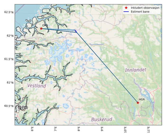 Kartet viser peilingene for meteoren. De lysere linjene viser retningene fra observasjonsstedene for meteorens tilsynekomst, og de mørkere linjene viser hvor den sist kunne sees. Den blå pila viser meteorens synlige ferd.