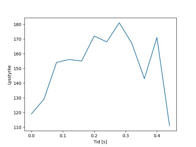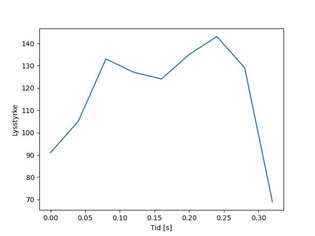 Plottet over viser meteorens høgde over bakken langs dens bane. Hver røde prikk svarer til hvor banen krysser siktelinjene.
