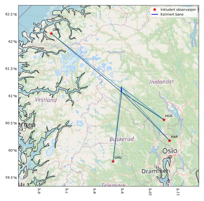Kartet viser peilingene for meteoren. De lysere linjene viser retningene fra observasjonsstedene for meteorens tilsynekomst, og de mørkere linjene viser hvor den sist kunne sees. Den blå pila viser meteorens synlige ferd.