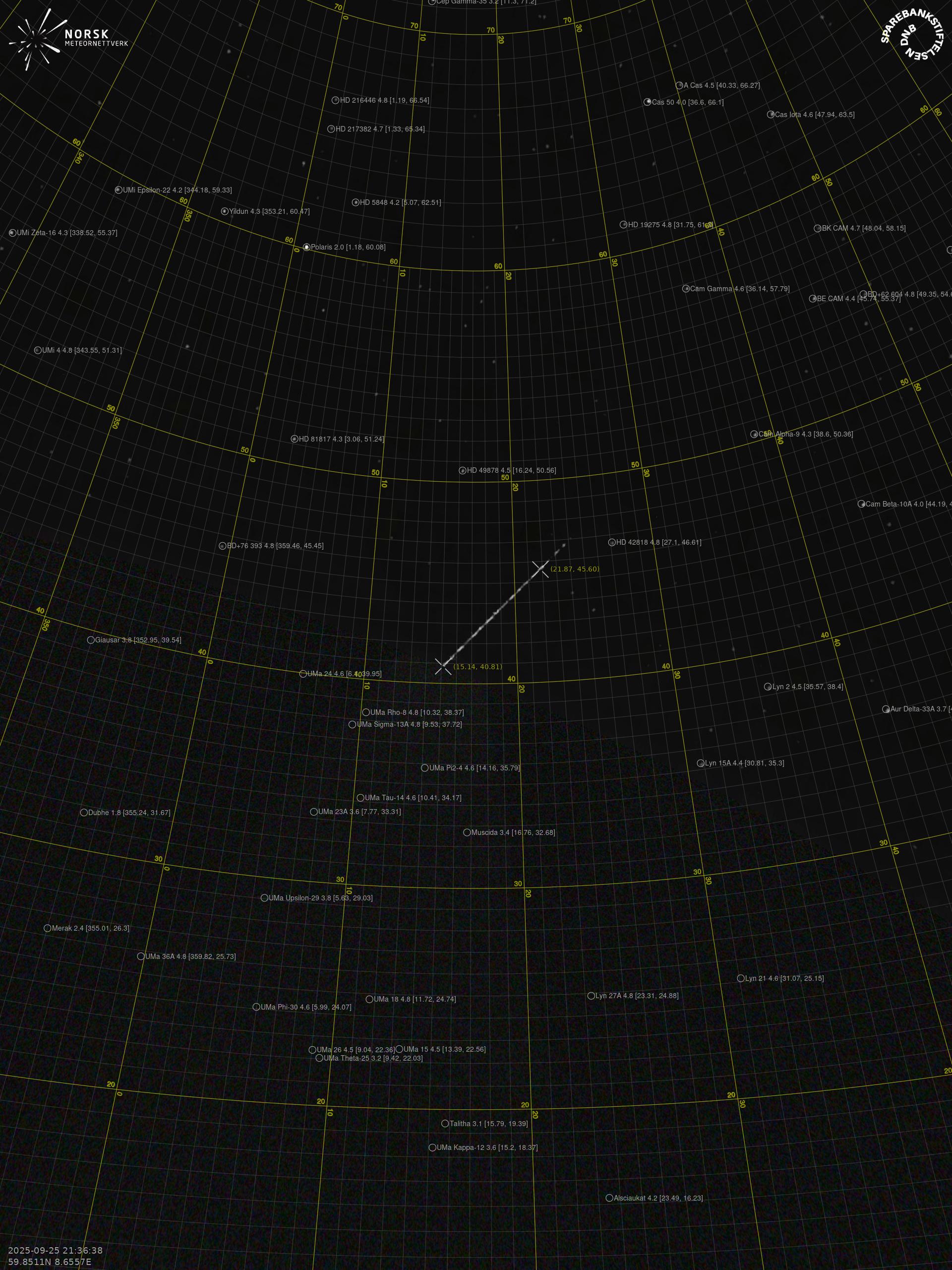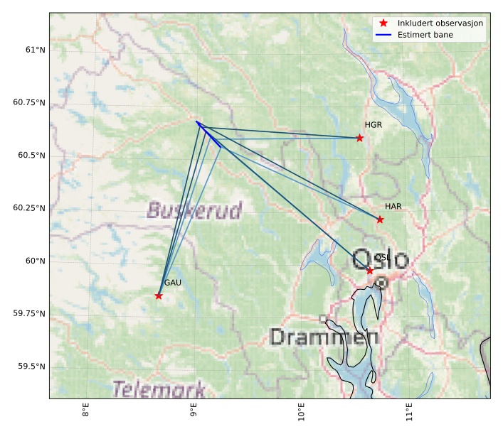 Kartet viser peilingene for meteoren. De lysere linjene viser retningene fra observasjonsstedene for meteorens tilsynekomst, og de mørkere linjene viser hvor den sist kunne sees. Den blå pila viser meteorens synlige ferd.