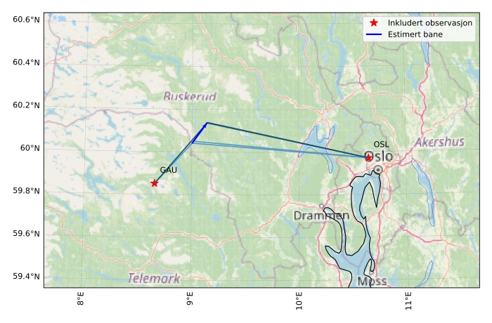Kartet viser peilingene for meteoren. De lysere linjene viser retningene fra observasjonsstedene for meteorens tilsynekomst, og de mørkere linjene viser hvor den sist kunne sees. Den blå pila viser meteorens synlige ferd.