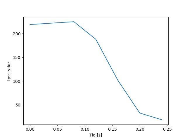 Plottet over viser meteorens høgde over bakken langs dens bane. Hver røde prikk svarer til hvor banen krysser siktelinjene.