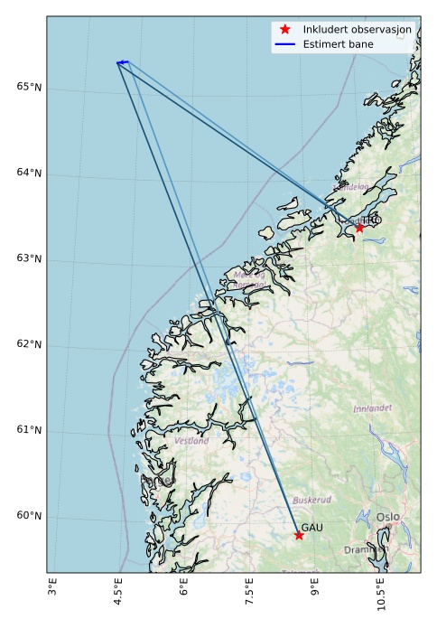 Kartet viser peilingene for meteoren. De lysere linjene viser retningene fra observasjonsstedene for meteorens tilsynekomst, og de mørkere linjene viser hvor den sist kunne sees. Den blå pila viser meteorens synlige ferd.