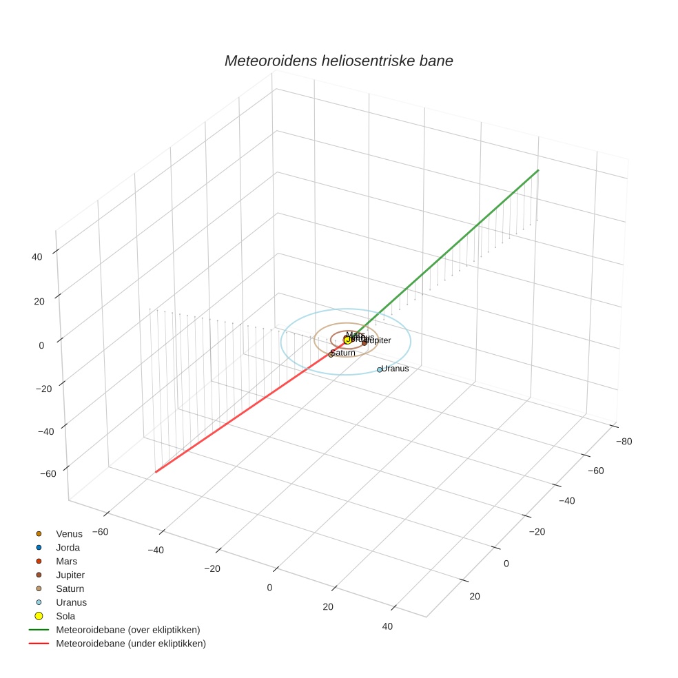 Plottet under viser meteoridens bane i solsystemet. Grønn del av banen ligger over ekliptikken og rød del under.