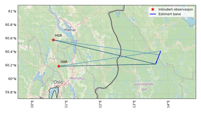 Kartet viser peilingene for meteoren. De lysere linjene viser retningene fra observasjonsstedene for meteorens tilsynekomst, og de mørkere linjene viser hvor den sist kunne sees. Den blå pila viser meteorens synlige ferd.
