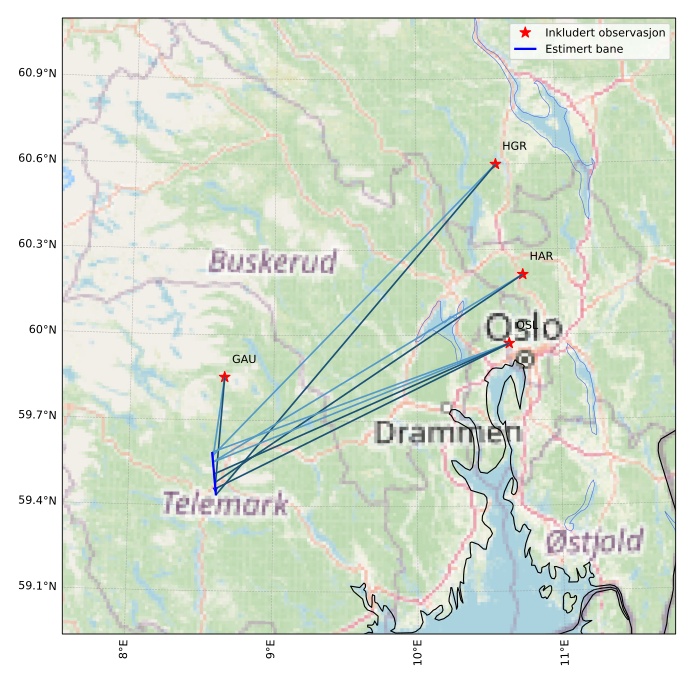 Kartet viser peilingene for meteoren. De lysere linjene viser retningene fra observasjonsstedene for meteorens tilsynekomst, og de mørkere linjene viser hvor den sist kunne sees. Den blå pila viser meteorens synlige ferd.