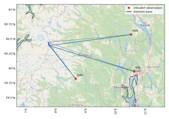 Kartet viser peilingene for meteoren. De lysere linjene viser retningene fra observasjonsstedene for meteorens tilsynekomst, og de mørkere linjene viser hvor den sist kunne sees. Den blå pila viser meteorens synlige ferd.