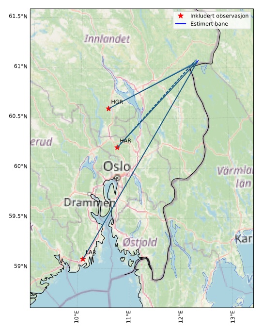 Kartet viser peilingene for meteoren. De lysere linjene viser retningene fra observasjonsstedene for meteorens tilsynekomst, og de mørkere linjene viser hvor den sist kunne sees. Den blå pila viser meteorens synlige ferd.