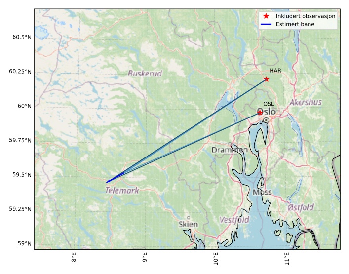 Kartet viser peilingene for meteoren. De lysere linjene viser retningene fra observasjonsstedene for meteorens tilsynekomst, og de mørkere linjene viser hvor den sist kunne sees. Den blå pila viser meteorens synlige ferd.