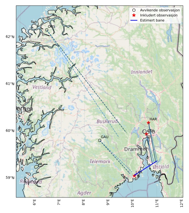 Kartet viser peilingene for meteoren. De lysere linjene viser retningene fra observasjonsstedene for meteorens tilsynekomst, og de mørkere linjene viser hvor den sist kunne sees. Den blå pila viser meteorens synlige ferd.