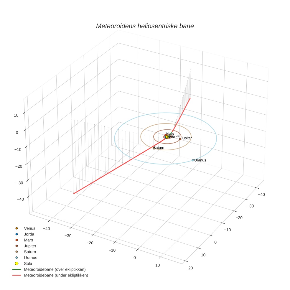 Plottet under viser meteoridens bane i solsystemet. Grønn del av banen ligger over ekliptikken og rød del under.