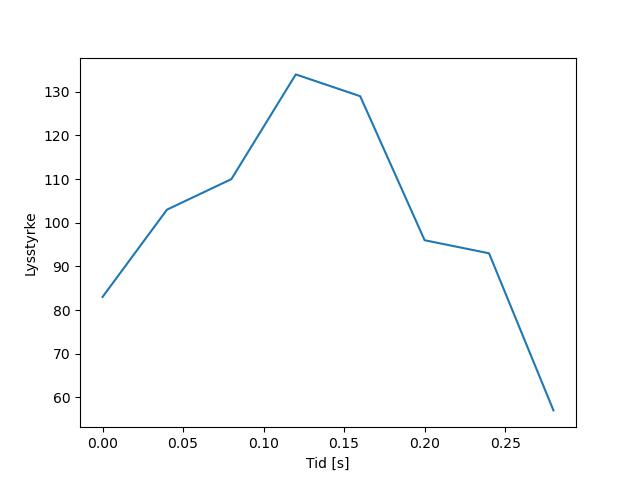 Plottet over viser meteorens høgde over bakken langs dens bane. Hver røde prikk svarer til hvor banen krysser siktelinjene.