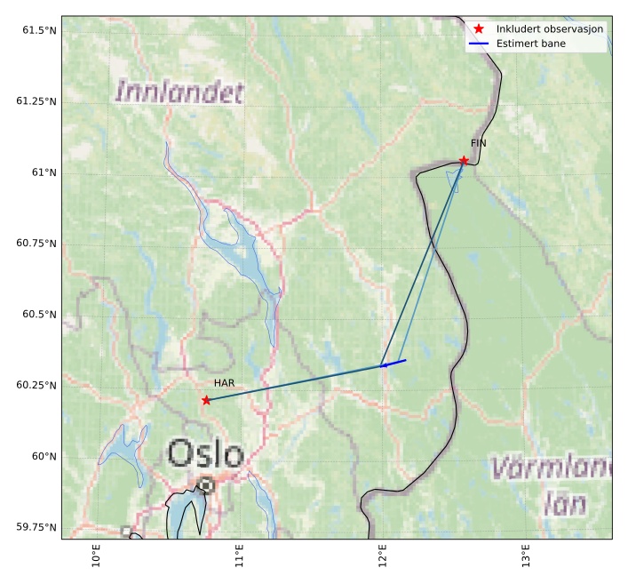 Kartet viser peilingene for meteoren. De lysere linjene viser retningene fra observasjonsstedene for meteorens tilsynekomst, og de mørkere linjene viser hvor den sist kunne sees. Den blå pila viser meteorens synlige ferd.