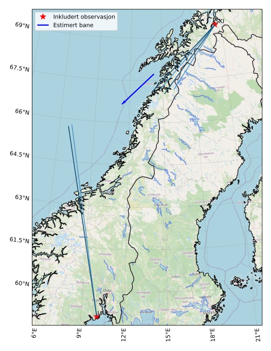 Kartet viser peilingene for meteoren. De lysere linjene viser retningene fra observasjonsstedene for meteorens tilsynekomst, og de mørkere linjene viser hvor den sist kunne sees. Den blå pila viser meteorens synlige ferd.
