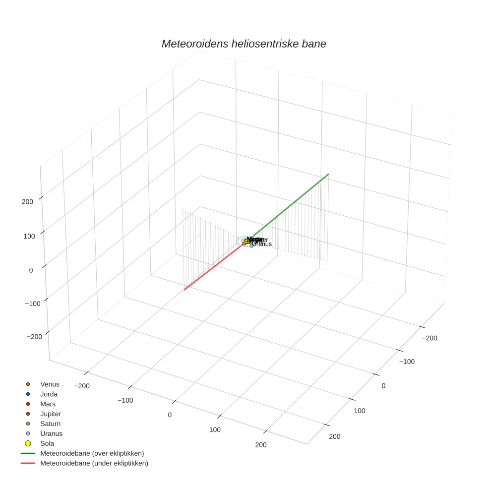 Plottet under viser meteoridens bane i solsystemet. Grønn del av banen ligger over ekliptikken og rød del under.