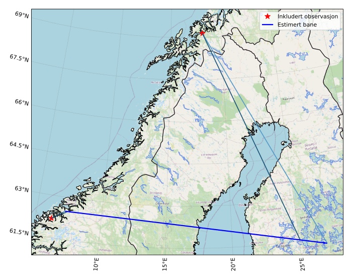 Kartet viser peilingene for meteoren. De lysere linjene viser retningene fra observasjonsstedene for meteorens tilsynekomst, og de mørkere linjene viser hvor den sist kunne sees. Den blå pila viser meteorens synlige ferd.