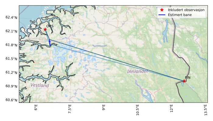 Kartet viser peilingene for meteoren. De lysere linjene viser retningene fra observasjonsstedene for meteorens tilsynekomst, og de mørkere linjene viser hvor den sist kunne sees. Den blå pila viser meteorens synlige ferd.