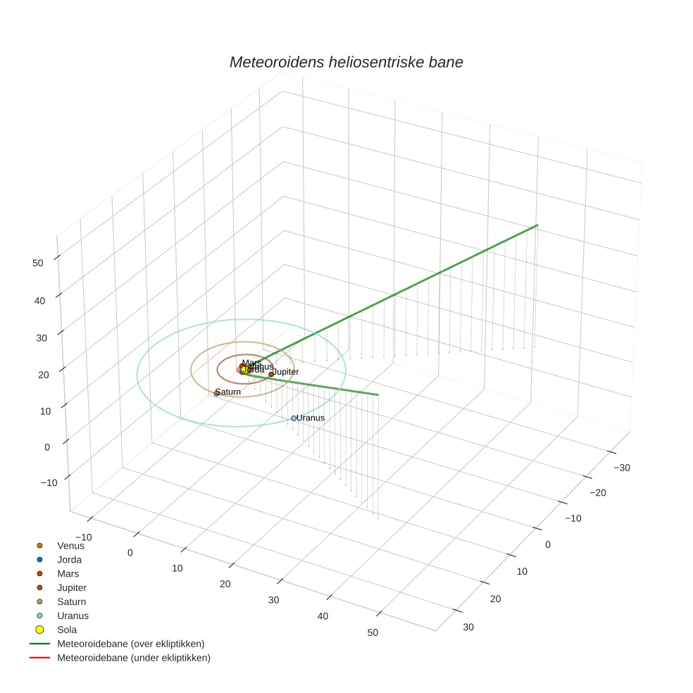 Plottet under viser meteoridens bane i solsystemet. Grønn del av banen ligger over ekliptikken og rød del under.