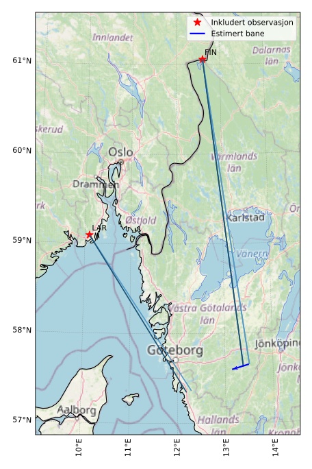 Kartet viser peilingene for meteoren. De lysere linjene viser retningene fra observasjonsstedene for meteorens tilsynekomst, og de mørkere linjene viser hvor den sist kunne sees. Den blå pila viser meteorens synlige ferd.