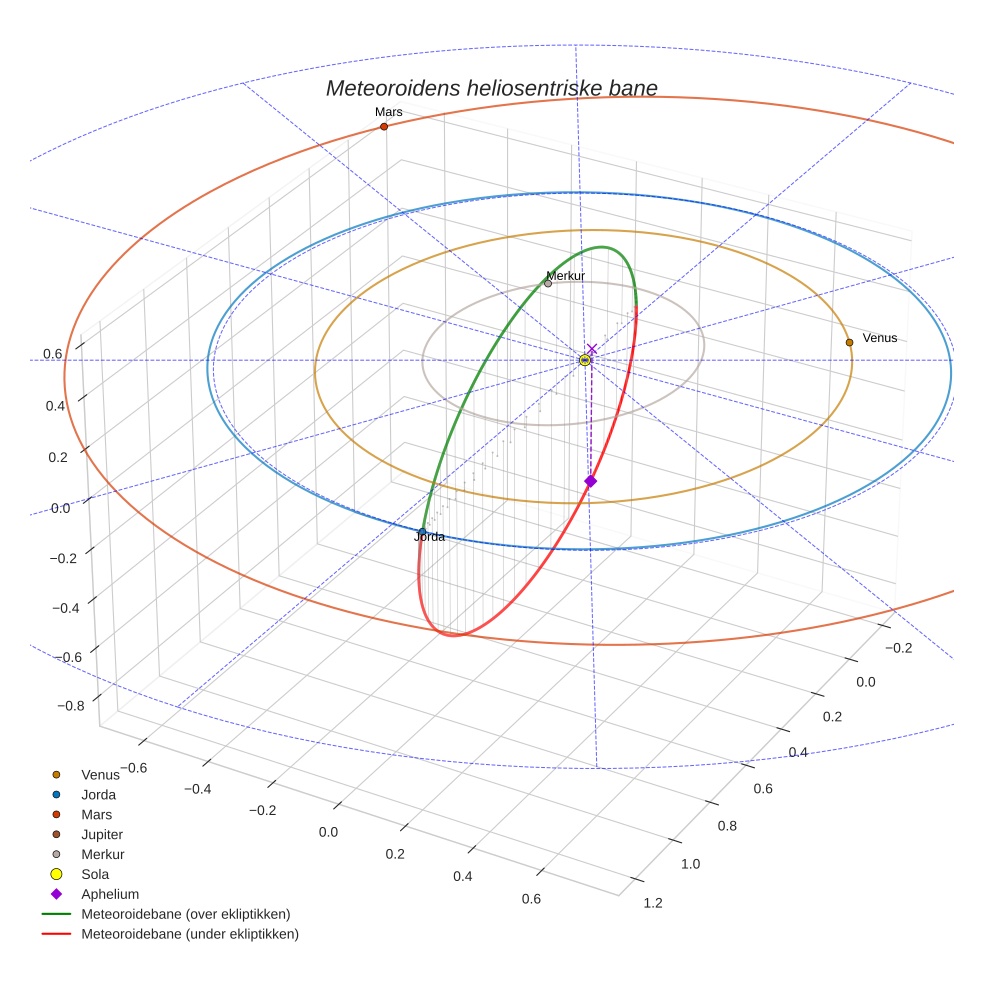Plottet under viser meteoridens bane i solsystemet. Grønn del av banen ligger over ekliptikken og rød del under.