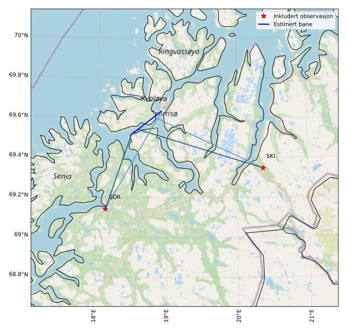 Kartet viser peilingene for meteoren. De lysere linjene viser retningene fra observasjonsstedene for meteorens tilsynekomst, og de mørkere linjene viser hvor den sist kunne sees. Den blå pila viser meteorens synlige ferd.