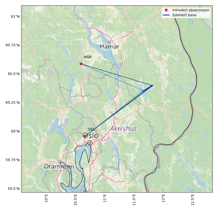 Kartet viser peilingene for meteoren. De lysere linjene viser retningene fra observasjonsstedene for meteorens tilsynekomst, og de mørkere linjene viser hvor den sist kunne sees. Den blå pila viser meteorens synlige ferd.