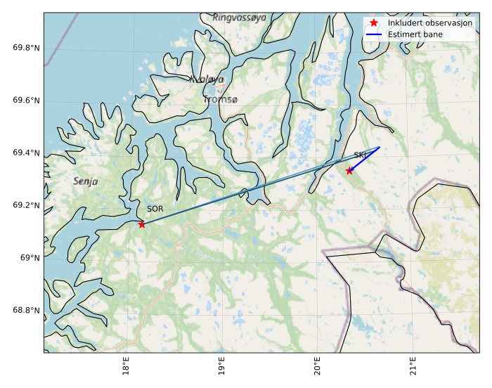 Kartet viser peilingene for meteoren. De lysere linjene viser retningene fra observasjonsstedene for meteorens tilsynekomst, og de mørkere linjene viser hvor den sist kunne sees. Den blå pila viser meteorens synlige ferd.
