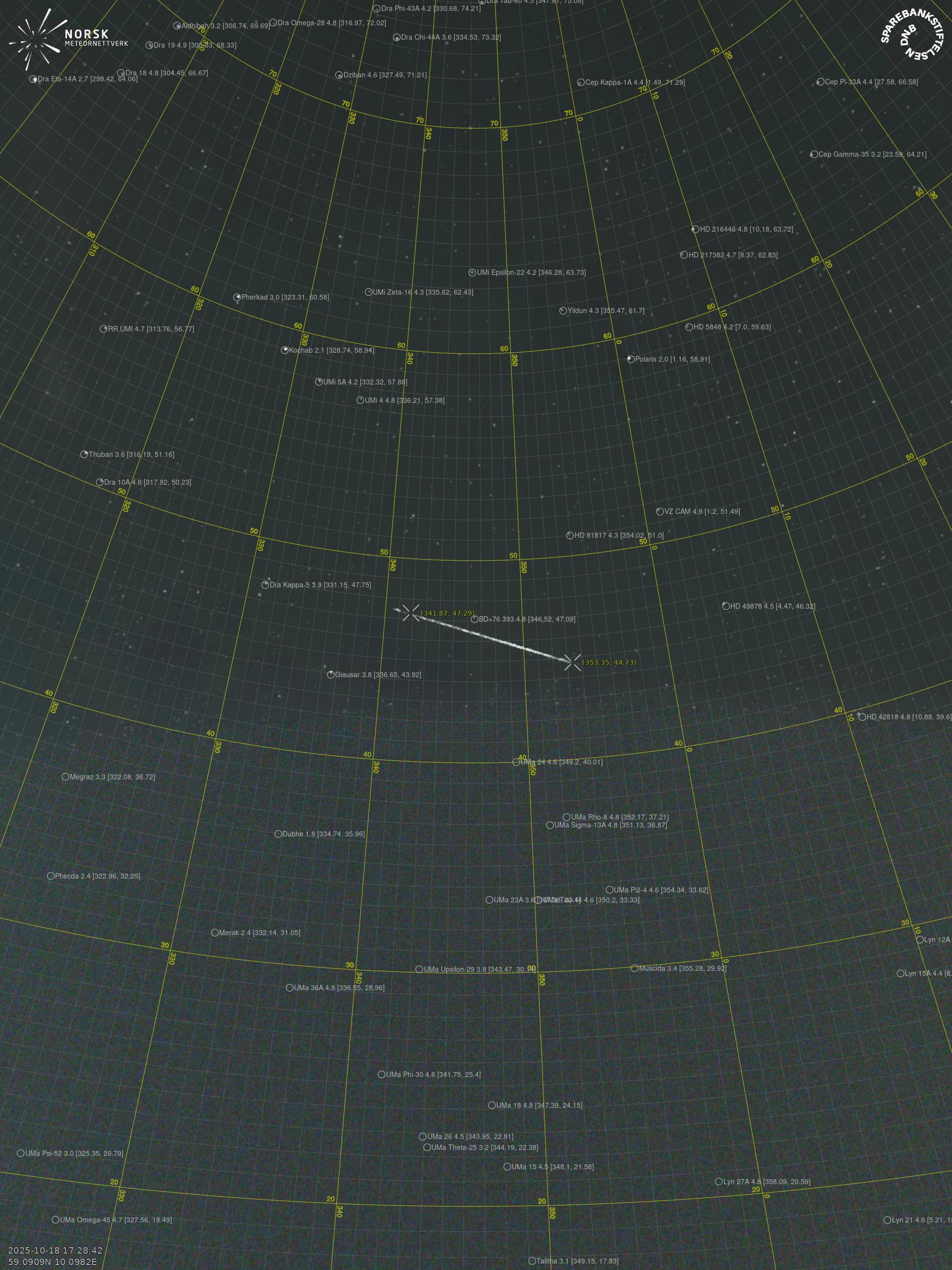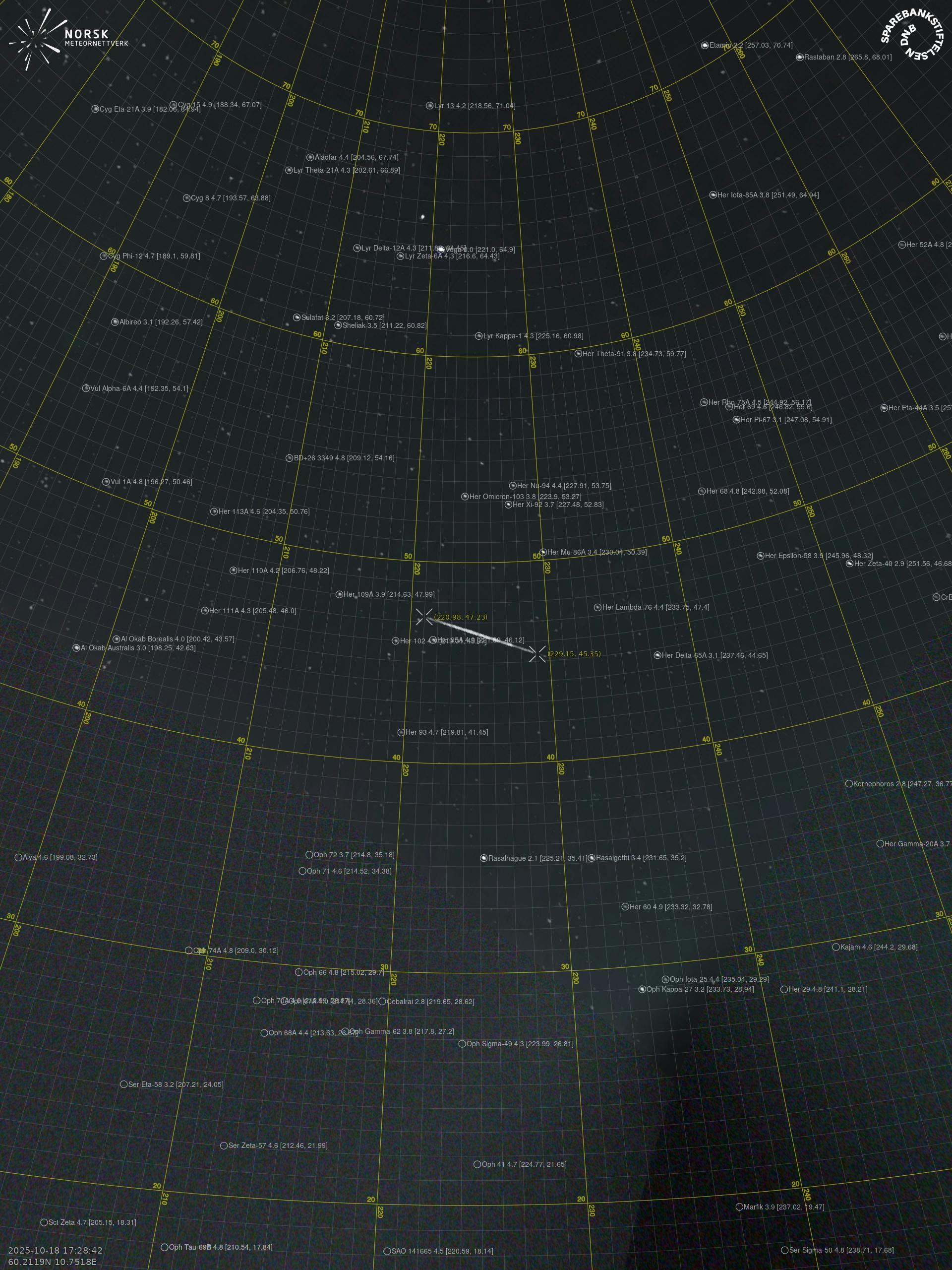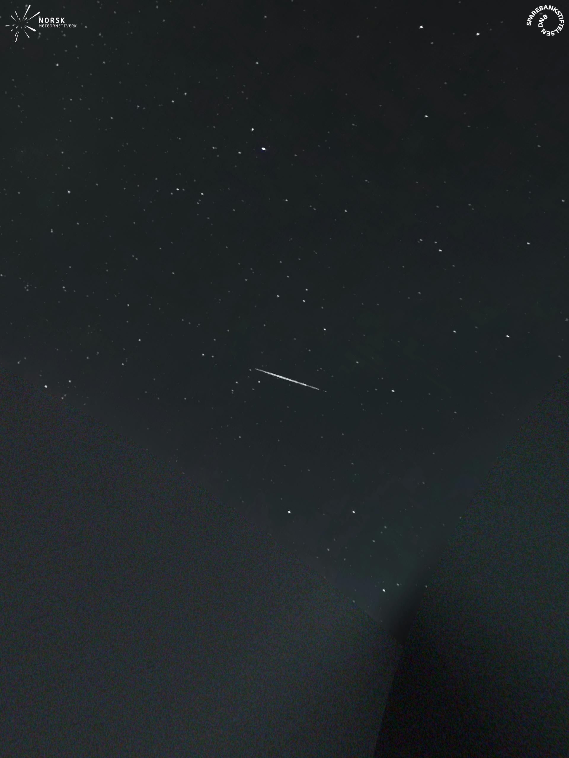 Kartet viser peilingene for meteoren. De lysere linjene viser retningene fra observasjonsstedene for meteorens tilsynekomst, og de mørkere linjene viser hvor den sist kunne sees. Den blå pila viser meteorens synlige ferd.