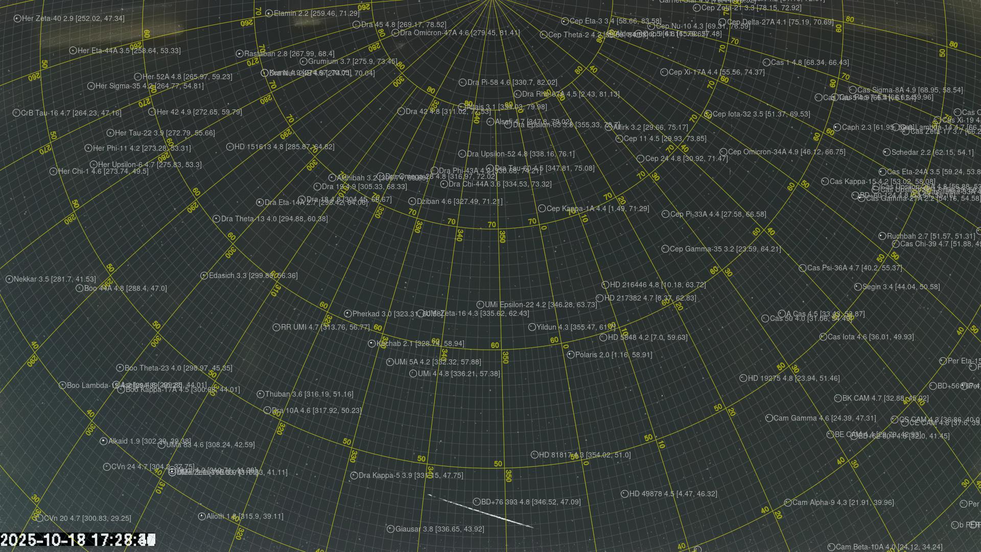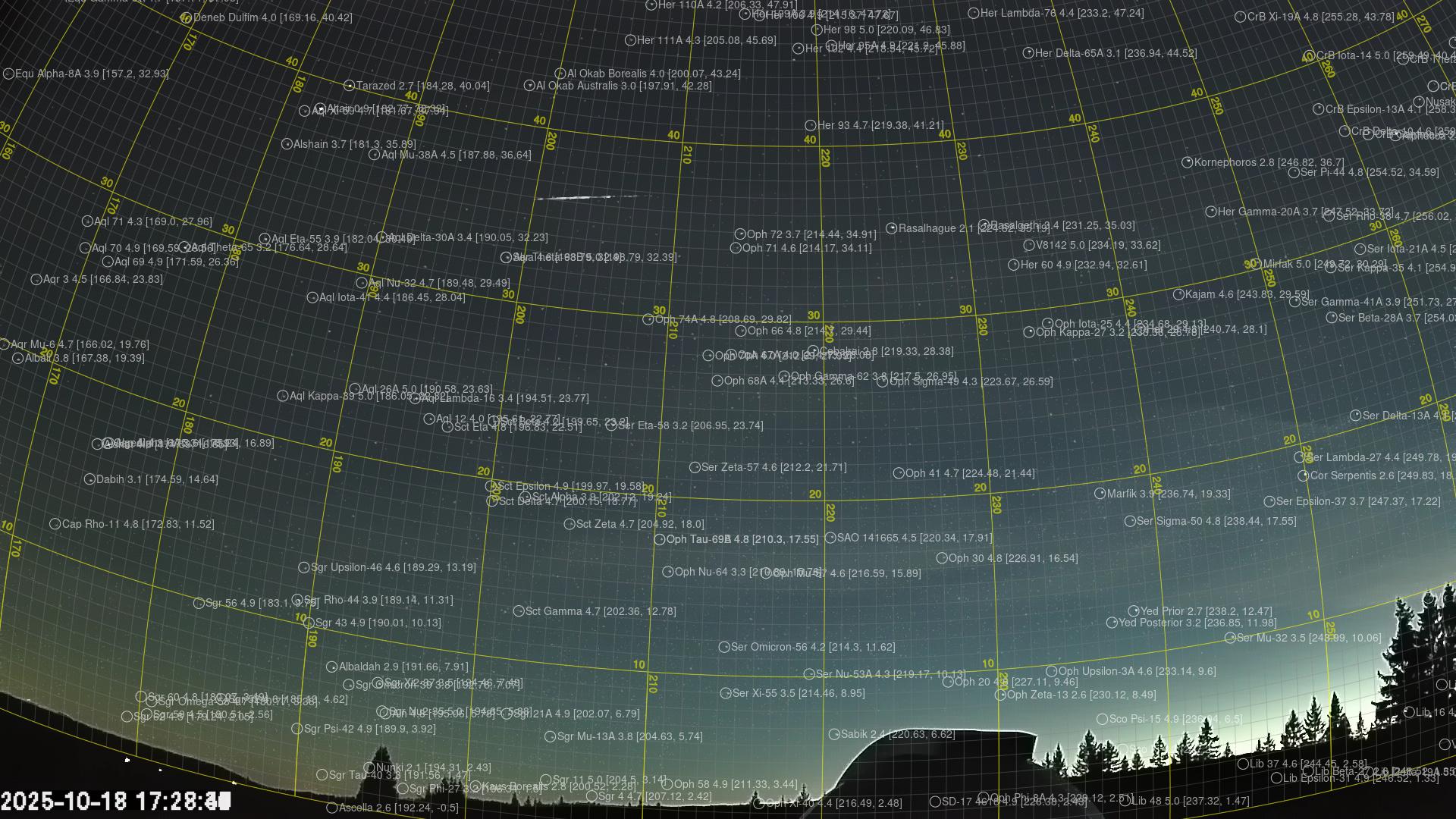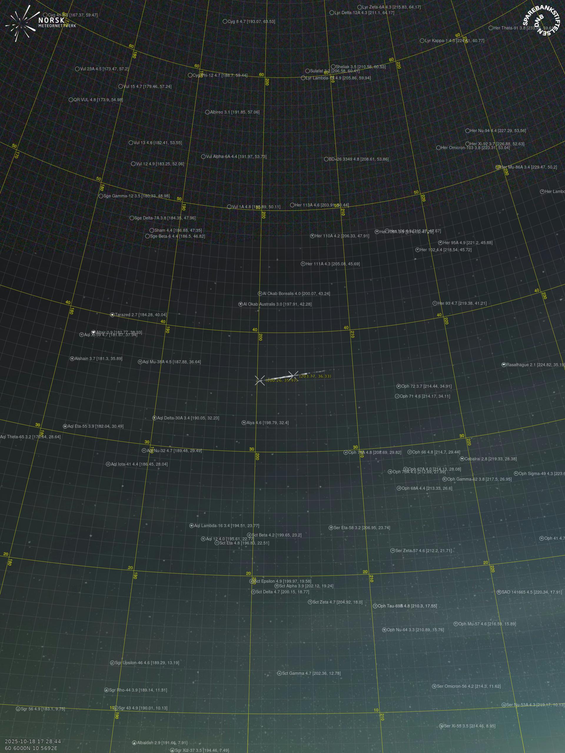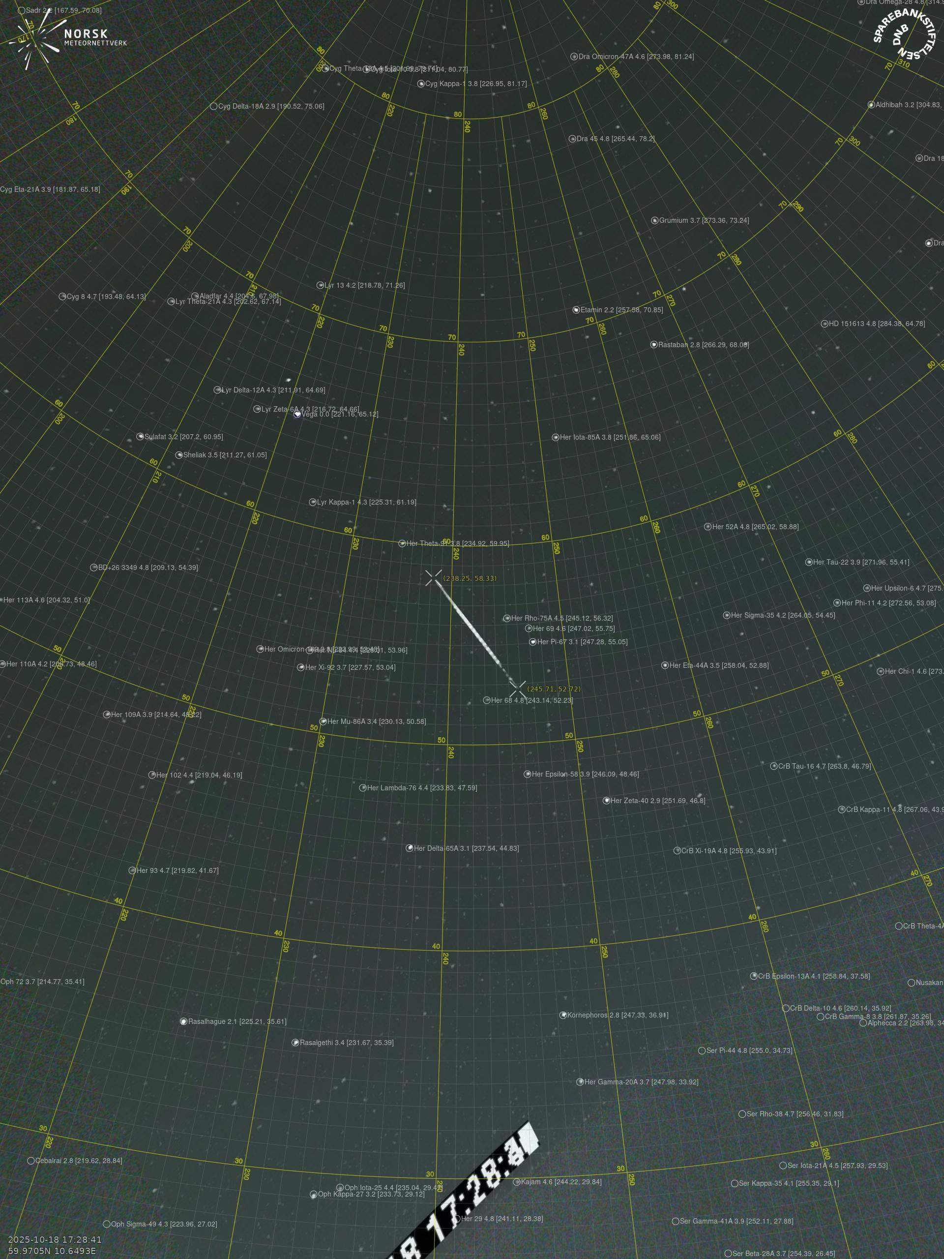 Kartet viser peilingene for meteoren. De lysere linjene viser retningene fra observasjonsstedene for meteorens tilsynekomst, og de mørkere linjene viser hvor den sist kunne sees. Den blå pila viser meteorens synlige ferd.