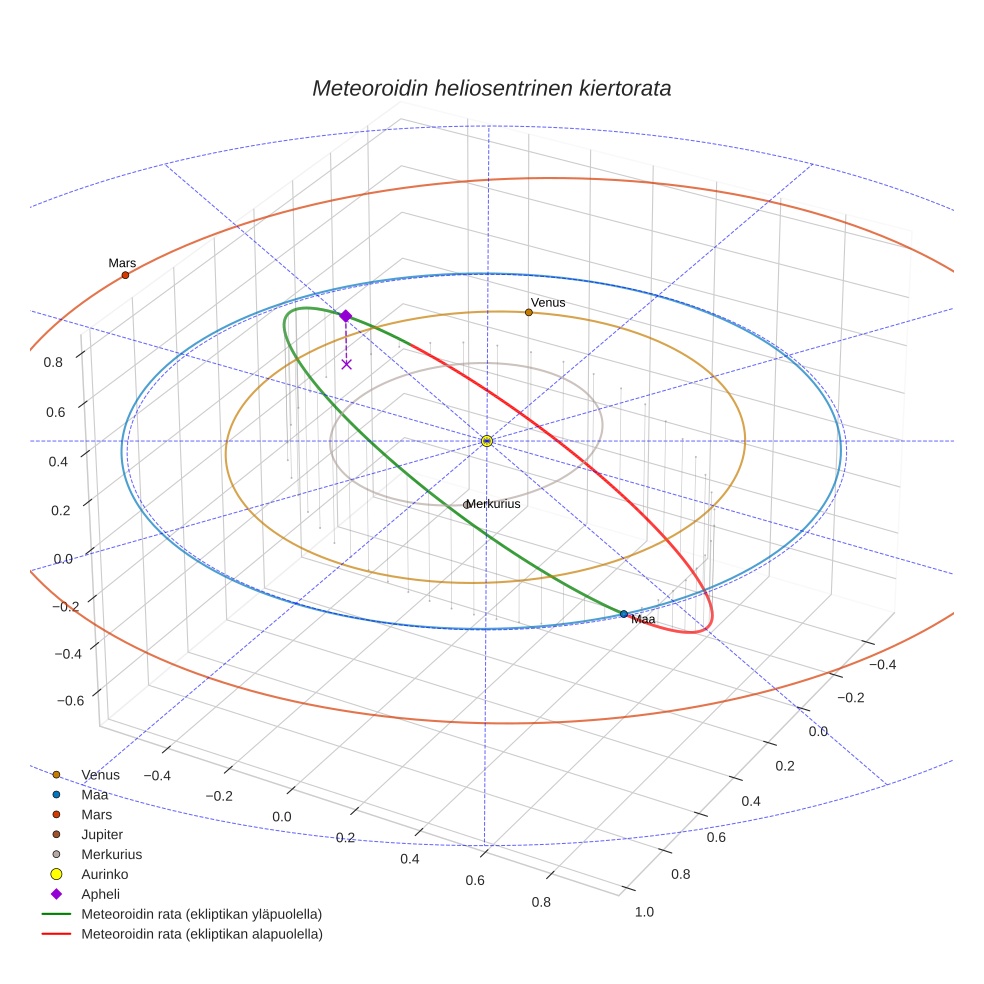 Kartta näyttää meteorin suuntahavainnot. Vaaleammat viivat näyttävät suunnat havaintoasemilta meteorin ilmestyessä, ja tummemmat viivat näyttävät, missä se viimeksi nähtiin. Sininen nuoli näyttää meteorin näkyvän lennon.