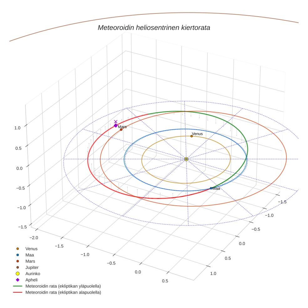 Kartta näyttää meteorin suuntahavainnot. Vaaleammat viivat näyttävät suunnat havaintoasemilta meteorin ilmestyessä, ja tummemmat viivat näyttävät, missä se viimeksi nähtiin. Sininen nuoli näyttää meteorin näkyvän lennon.