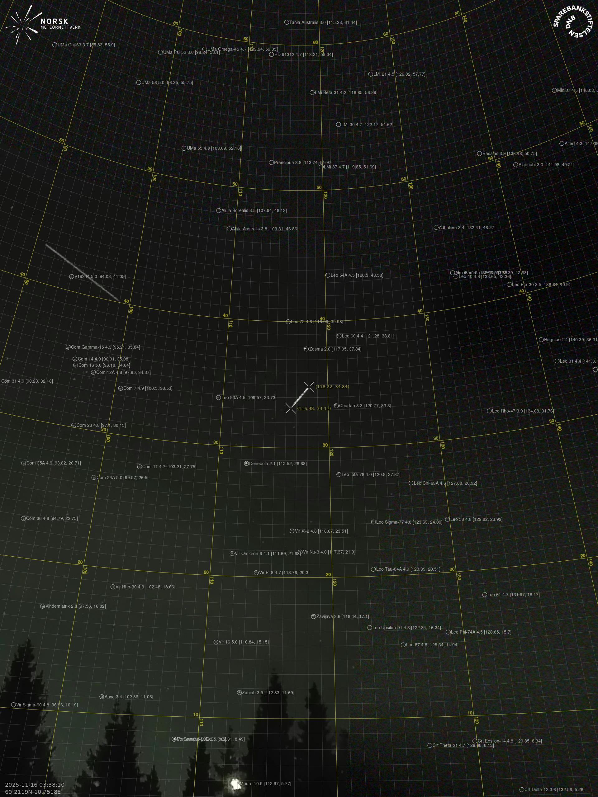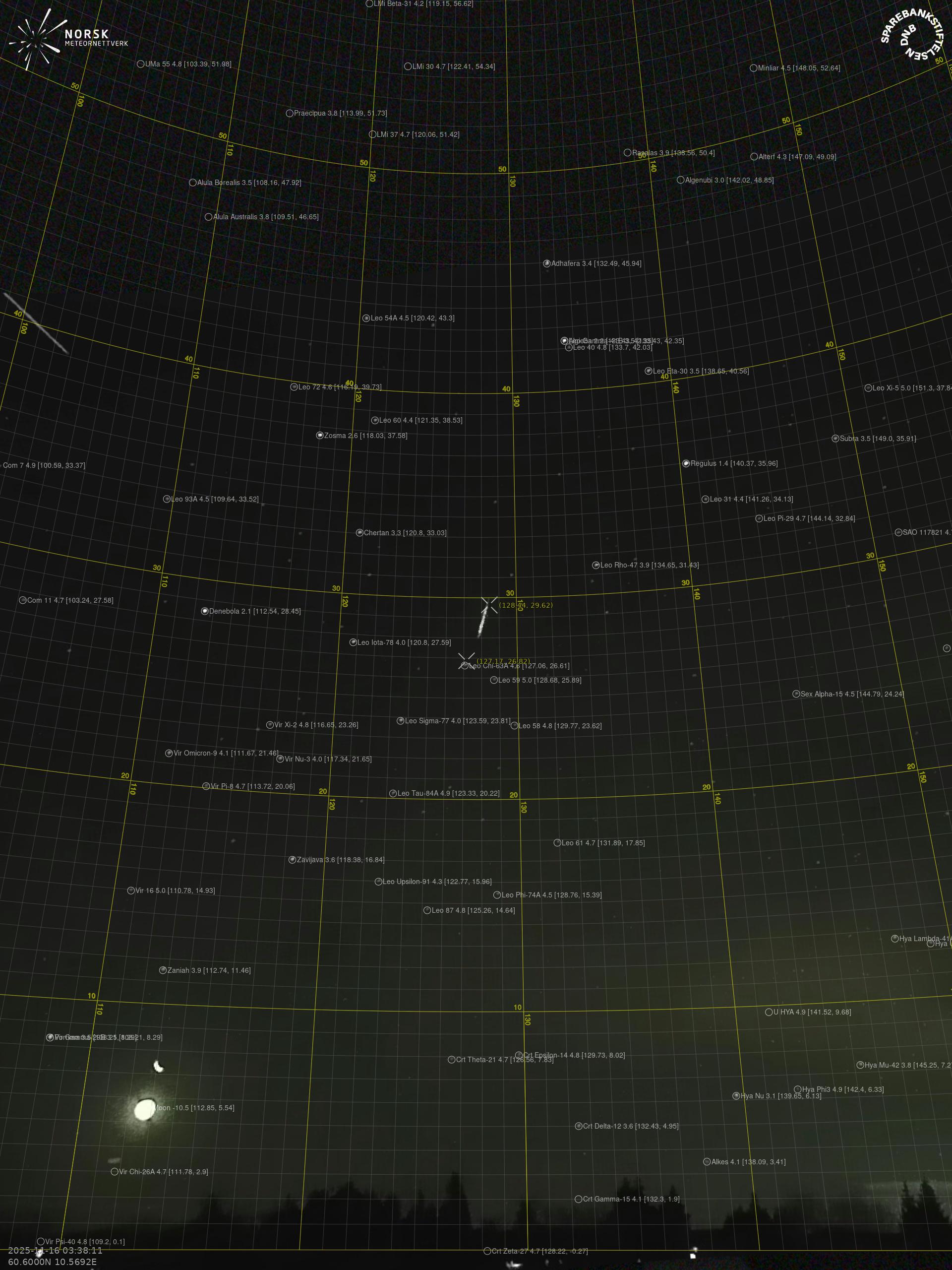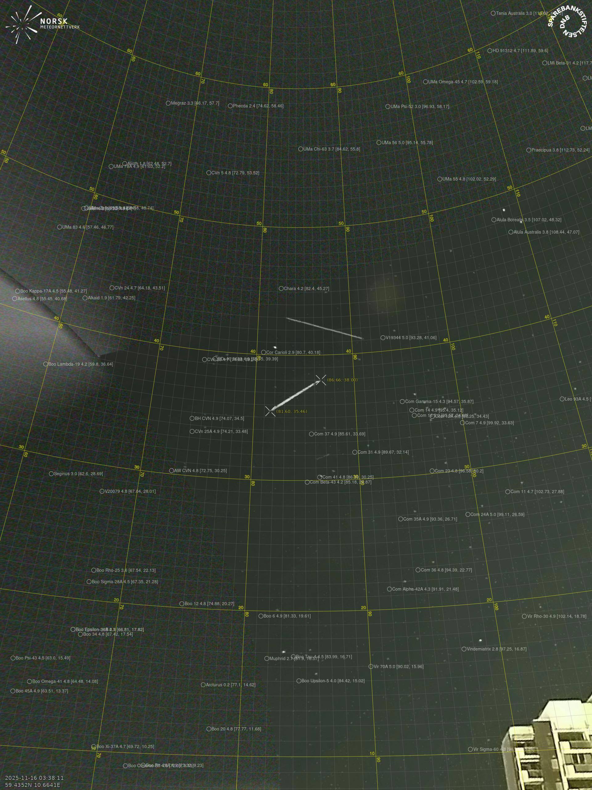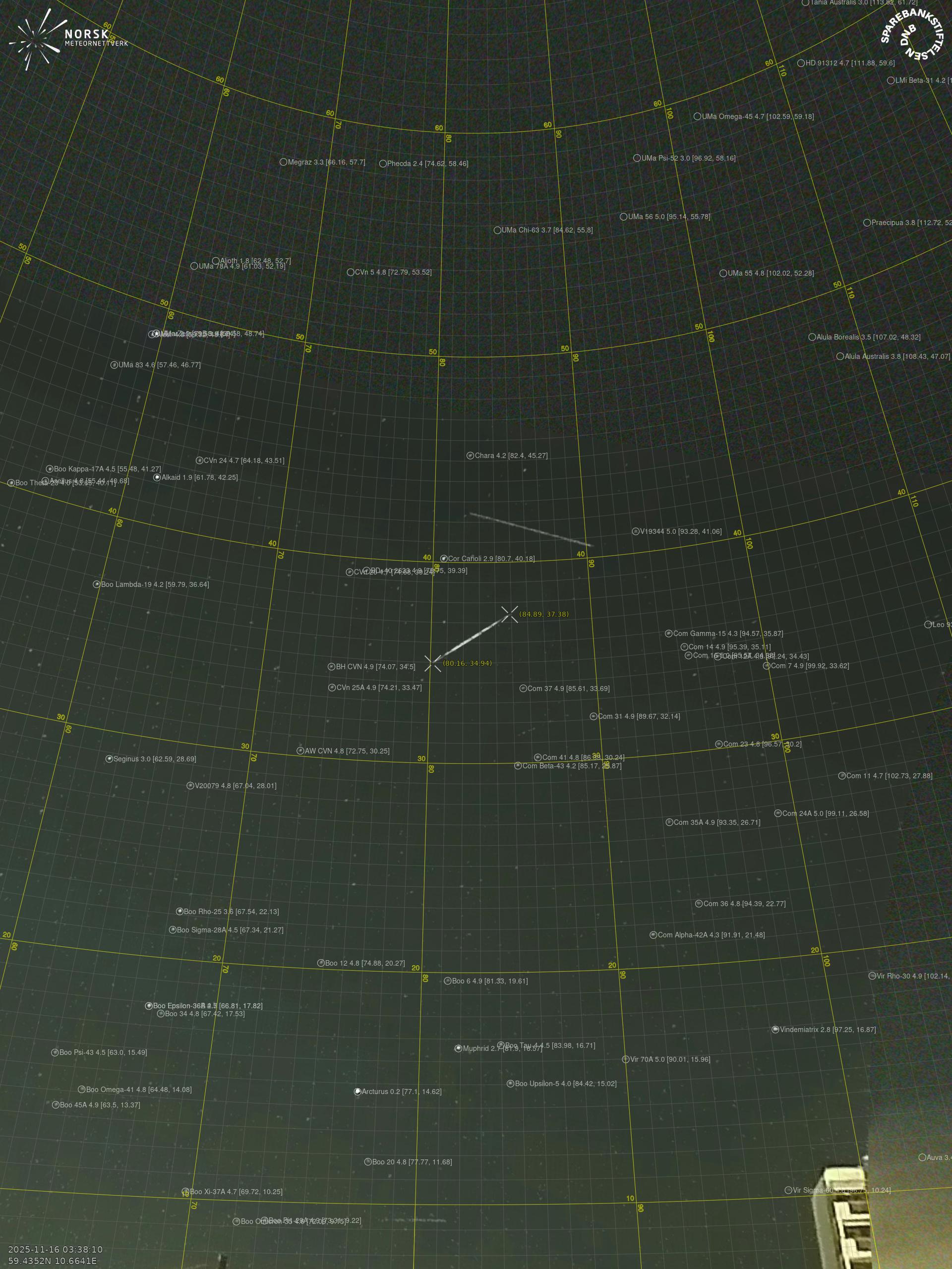 Kartta näyttää meteorin suuntahavainnot. Vaaleammat viivat näyttävät suunnat havaintoasemilta meteorin ilmestyessä, ja tummemmat viivat näyttävät, missä se viimeksi nähtiin. Sininen nuoli näyttää meteorin näkyvän lennon.