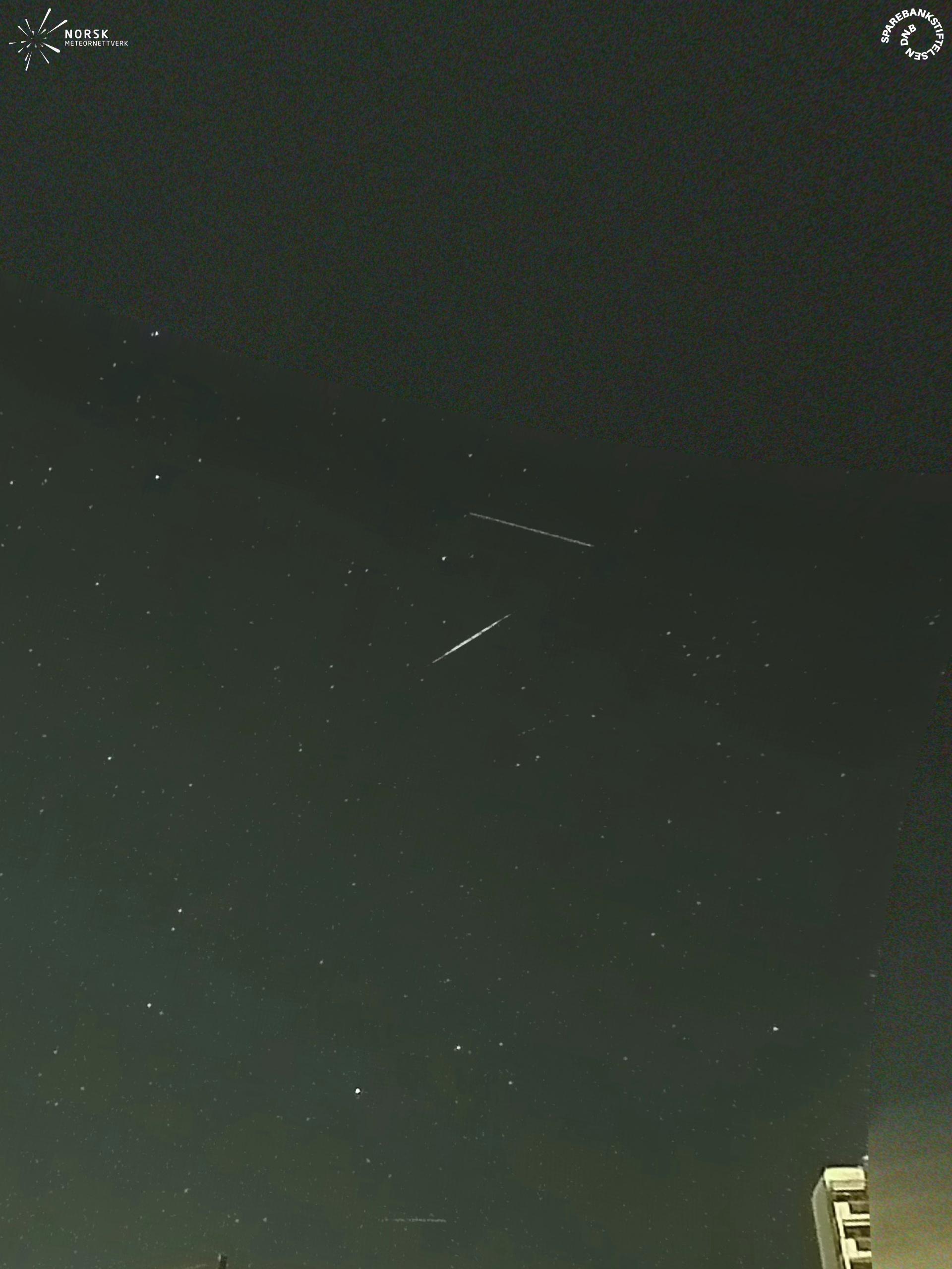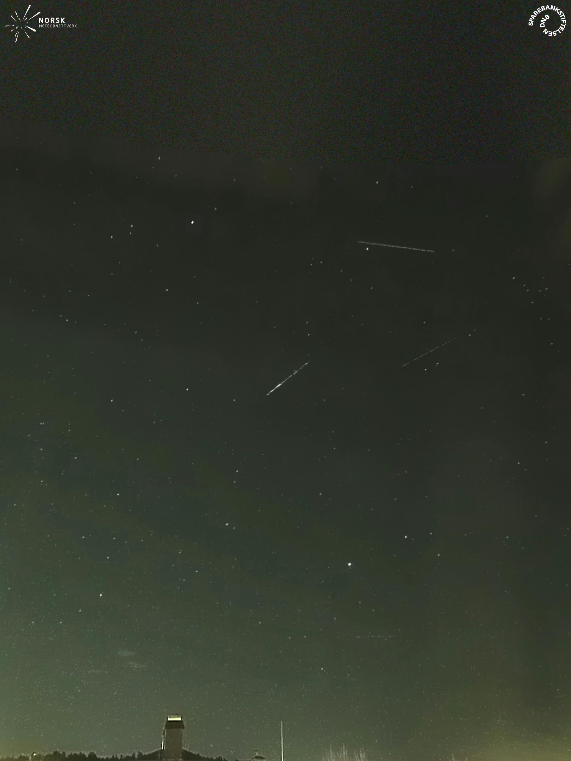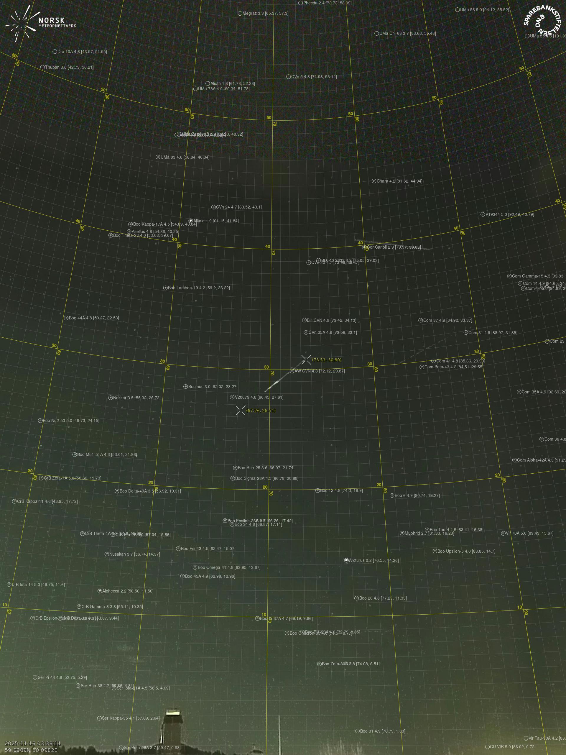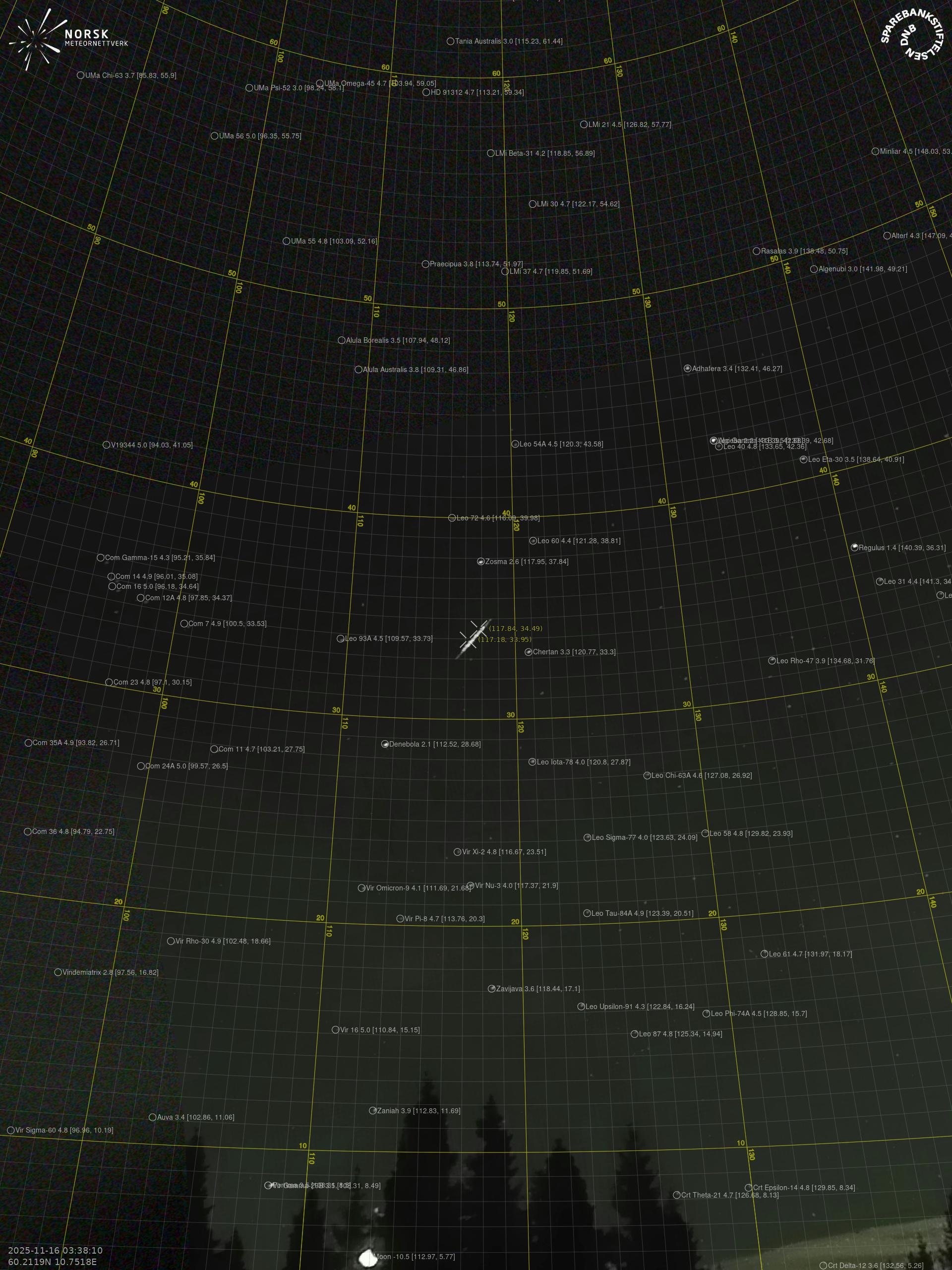 Kartta näyttää meteorin suuntahavainnot. Vaaleammat viivat näyttävät suunnat havaintoasemilta meteorin ilmestyessä, ja tummemmat viivat näyttävät, missä se viimeksi nähtiin. Sininen nuoli näyttää meteorin näkyvän lennon.