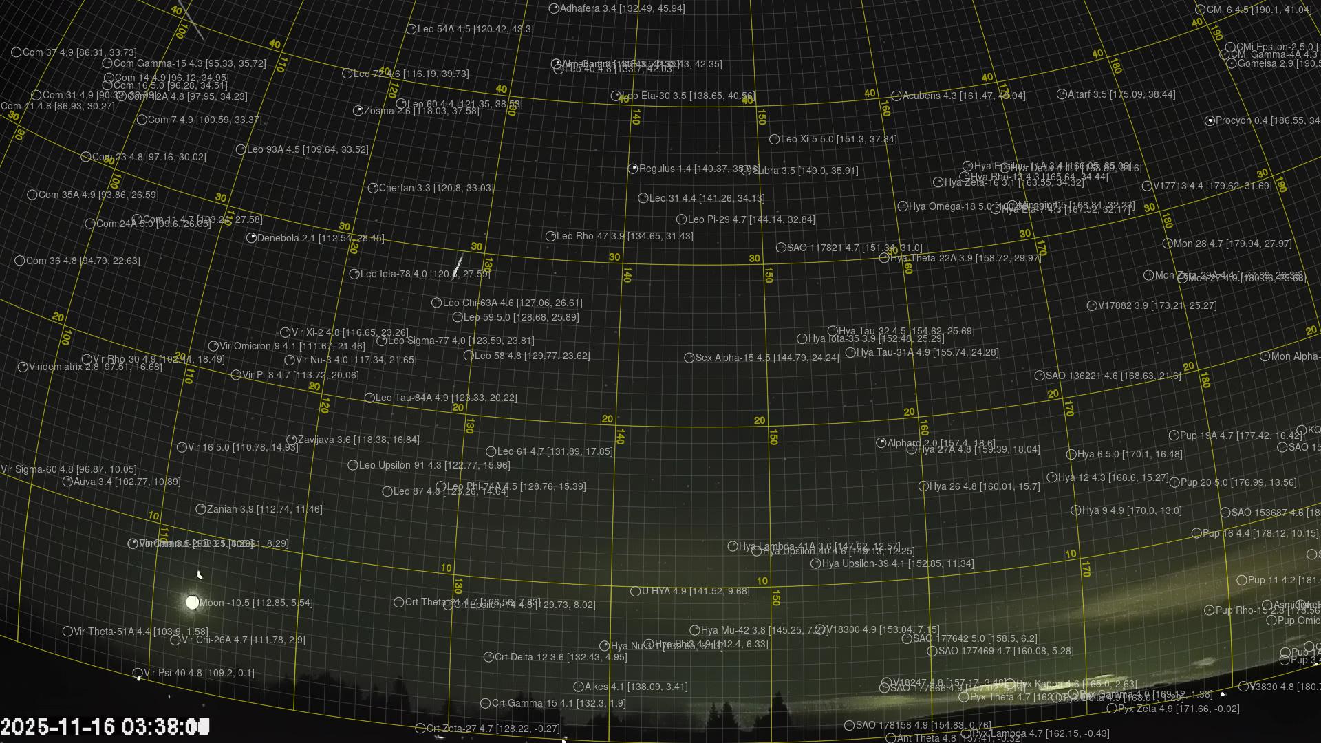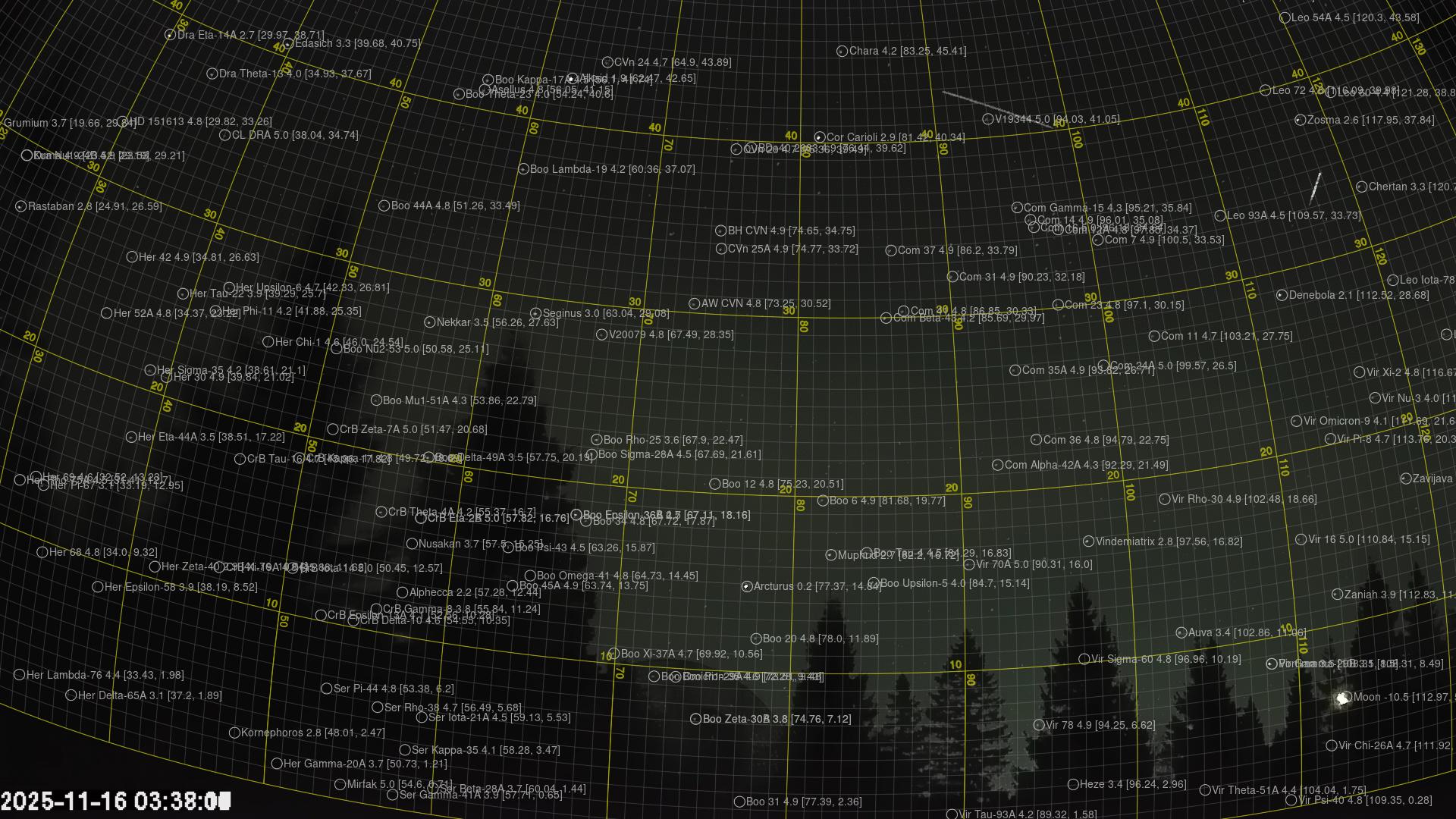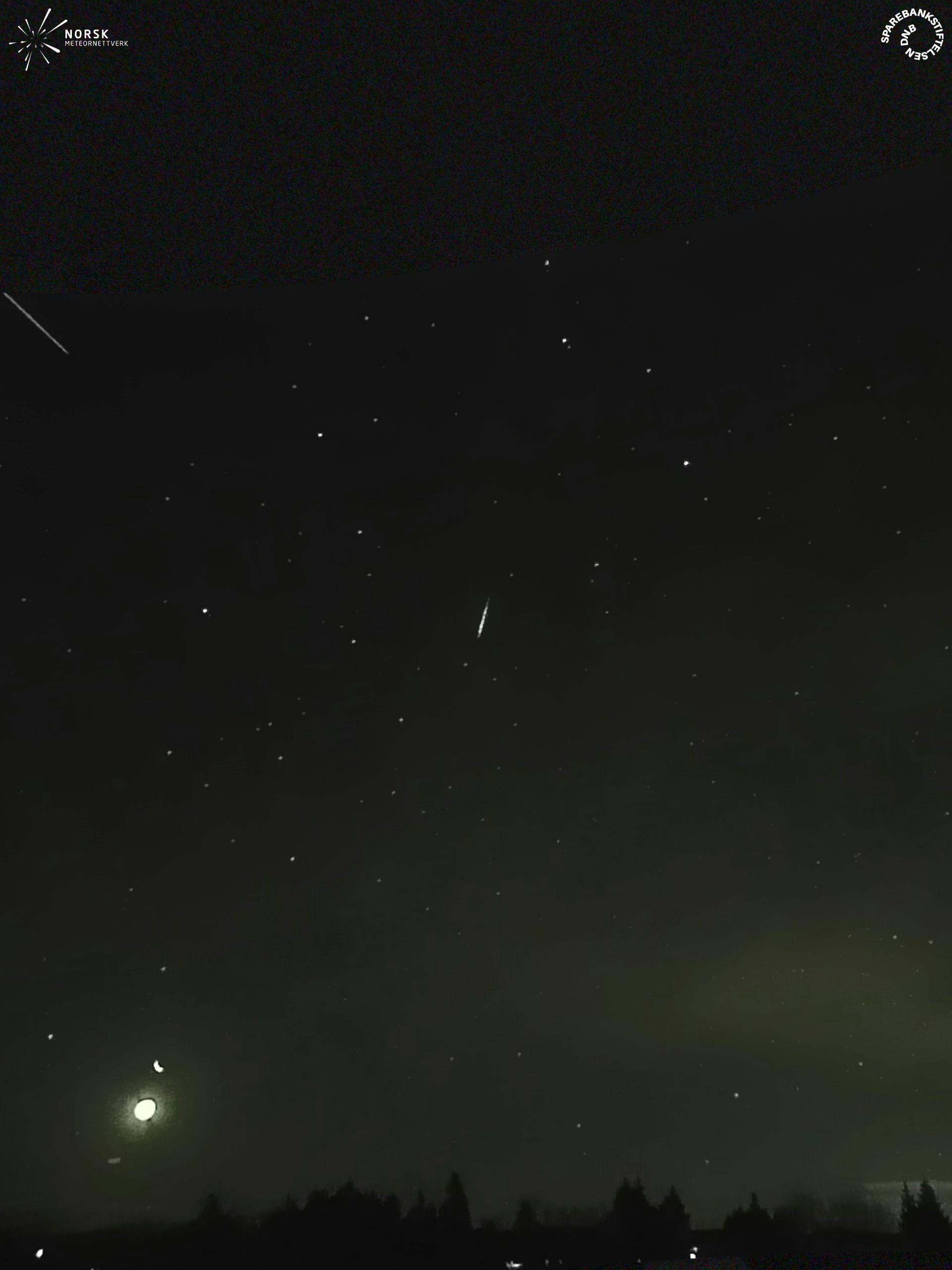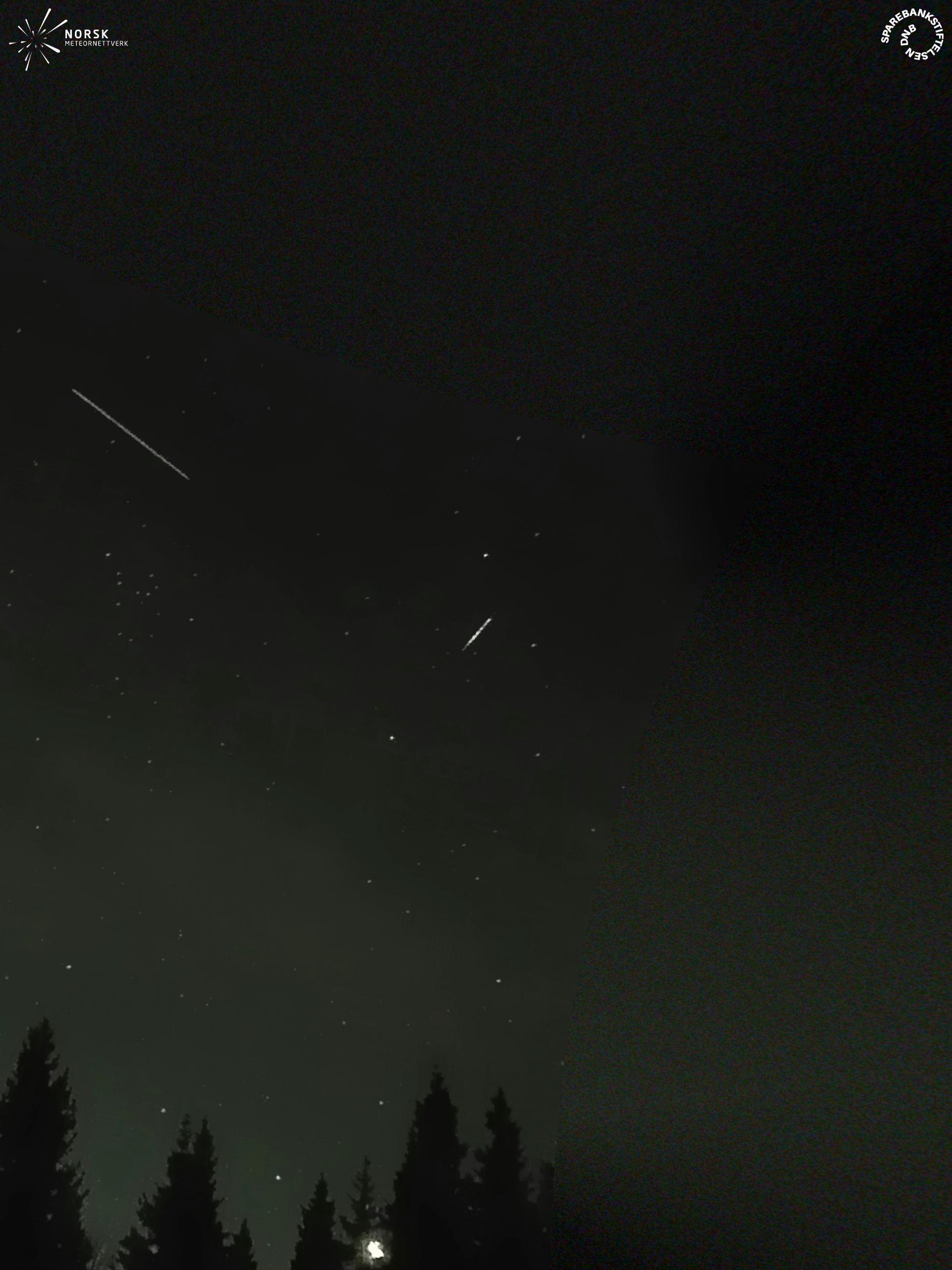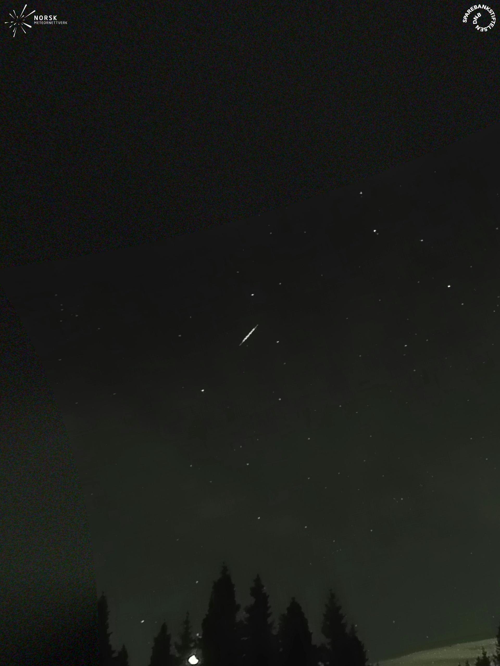 Kartta näyttää meteorin suuntahavainnot. Vaaleammat viivat näyttävät suunnat havaintoasemilta meteorin ilmestyessä, ja tummemmat viivat näyttävät, missä se viimeksi nähtiin. Sininen nuoli näyttää meteorin näkyvän lennon.