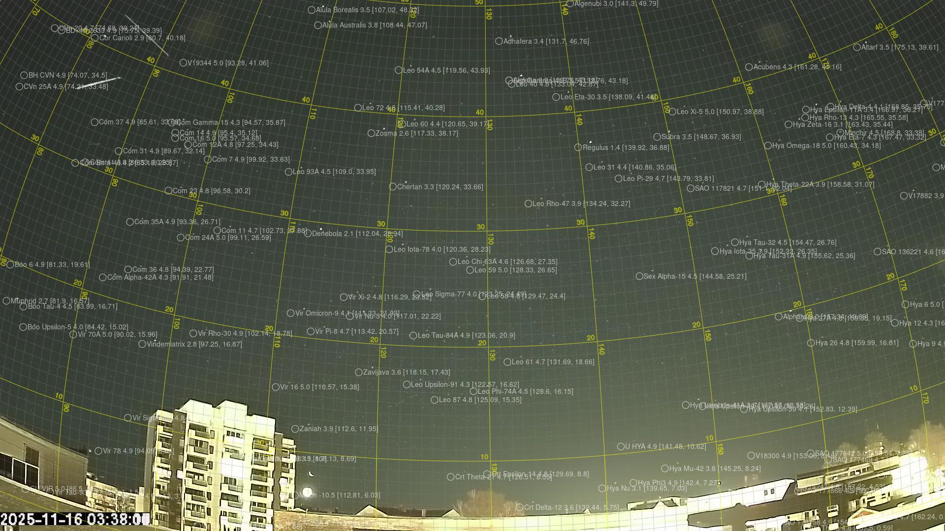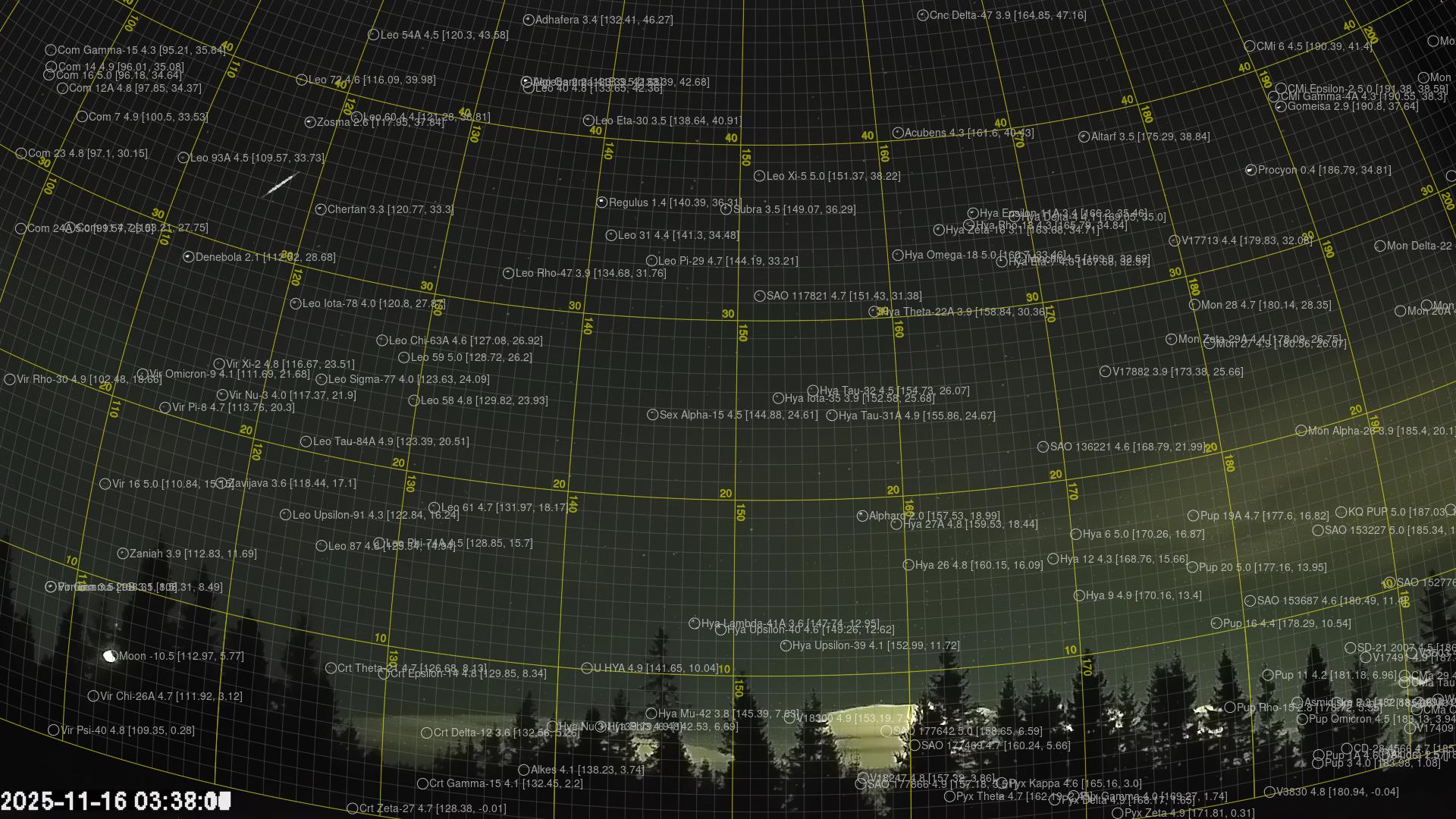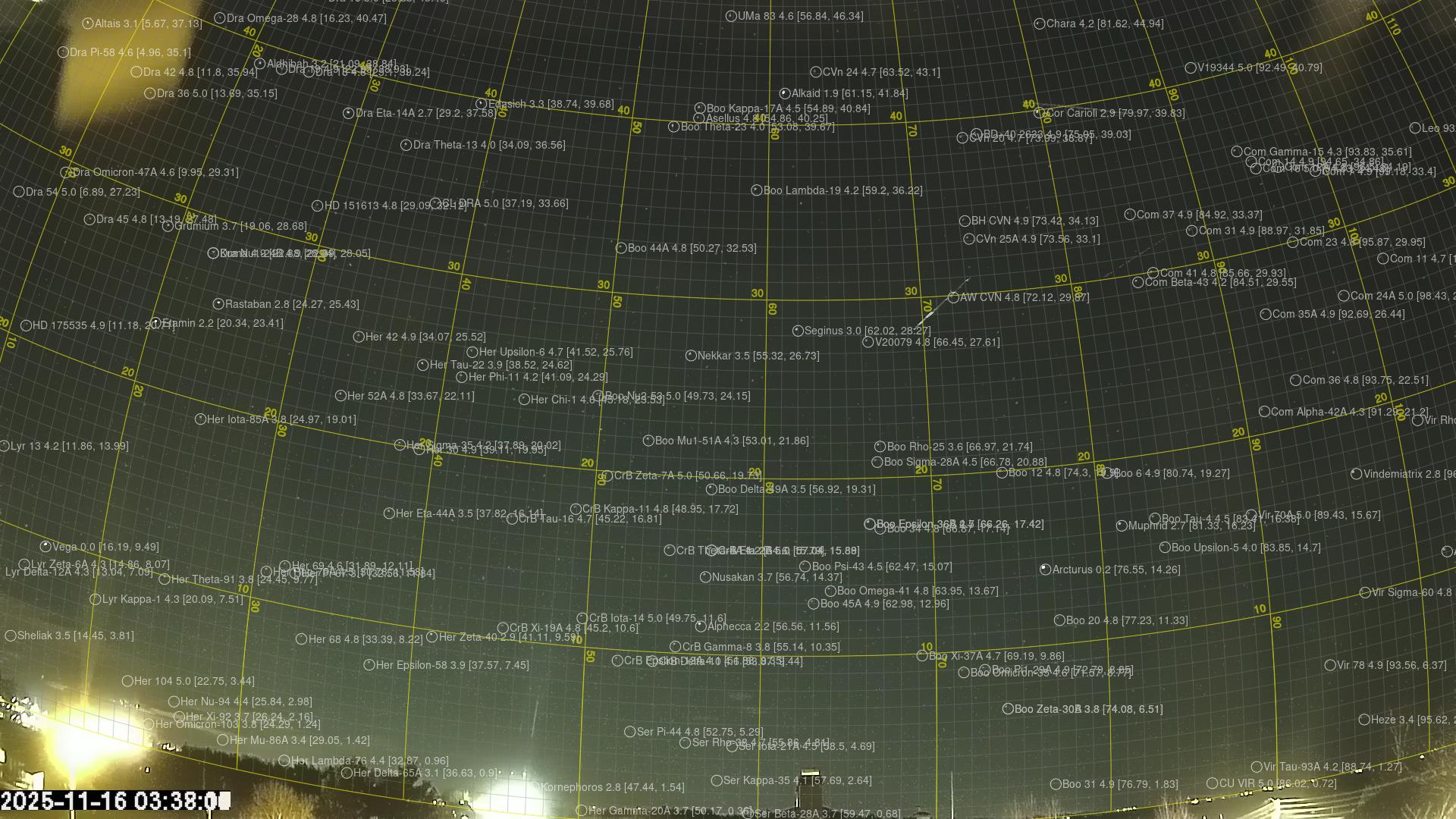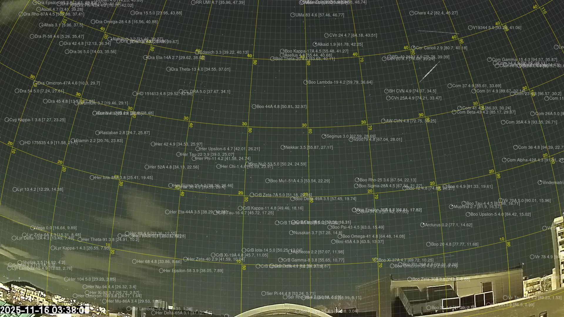 Kartta näyttää meteorin suuntahavainnot. Vaaleammat viivat näyttävät suunnat havaintoasemilta meteorin ilmestyessä, ja tummemmat viivat näyttävät, missä se viimeksi nähtiin. Sininen nuoli näyttää meteorin näkyvän lennon.