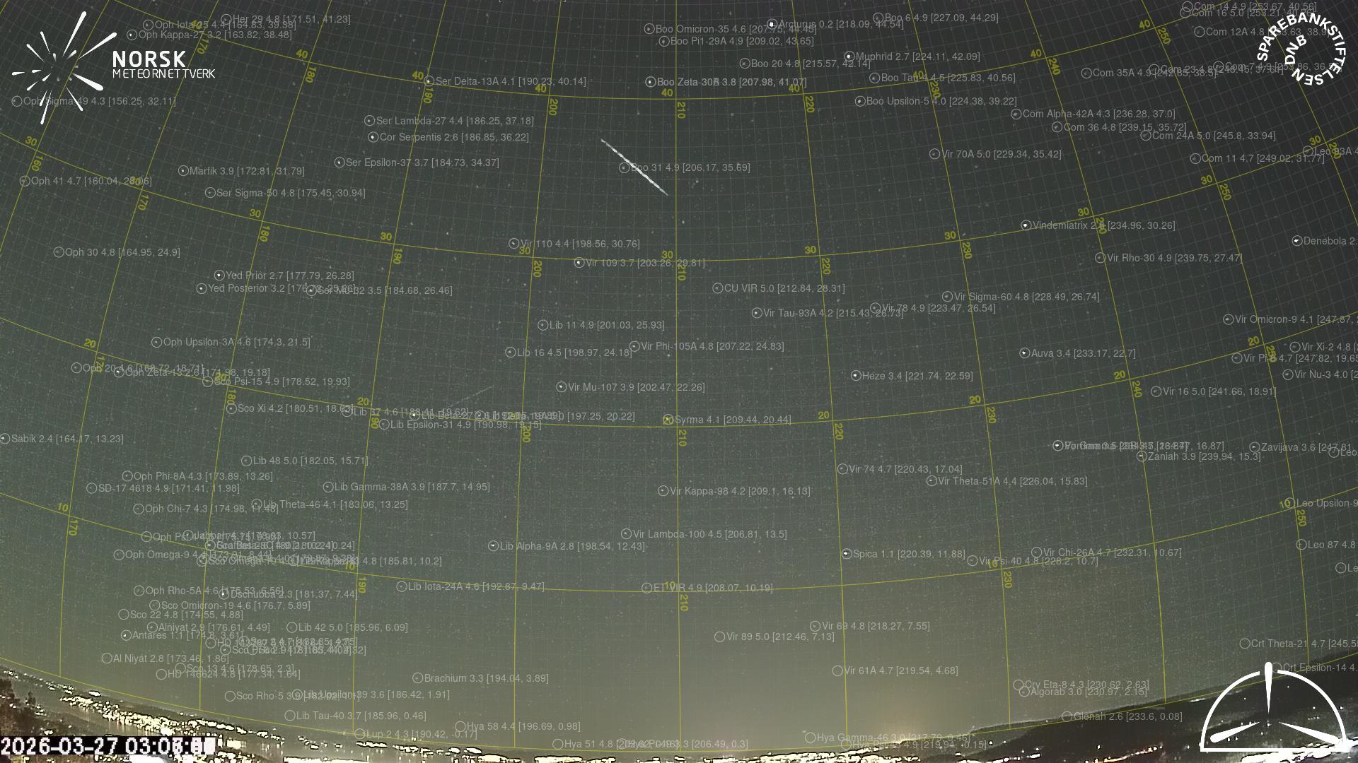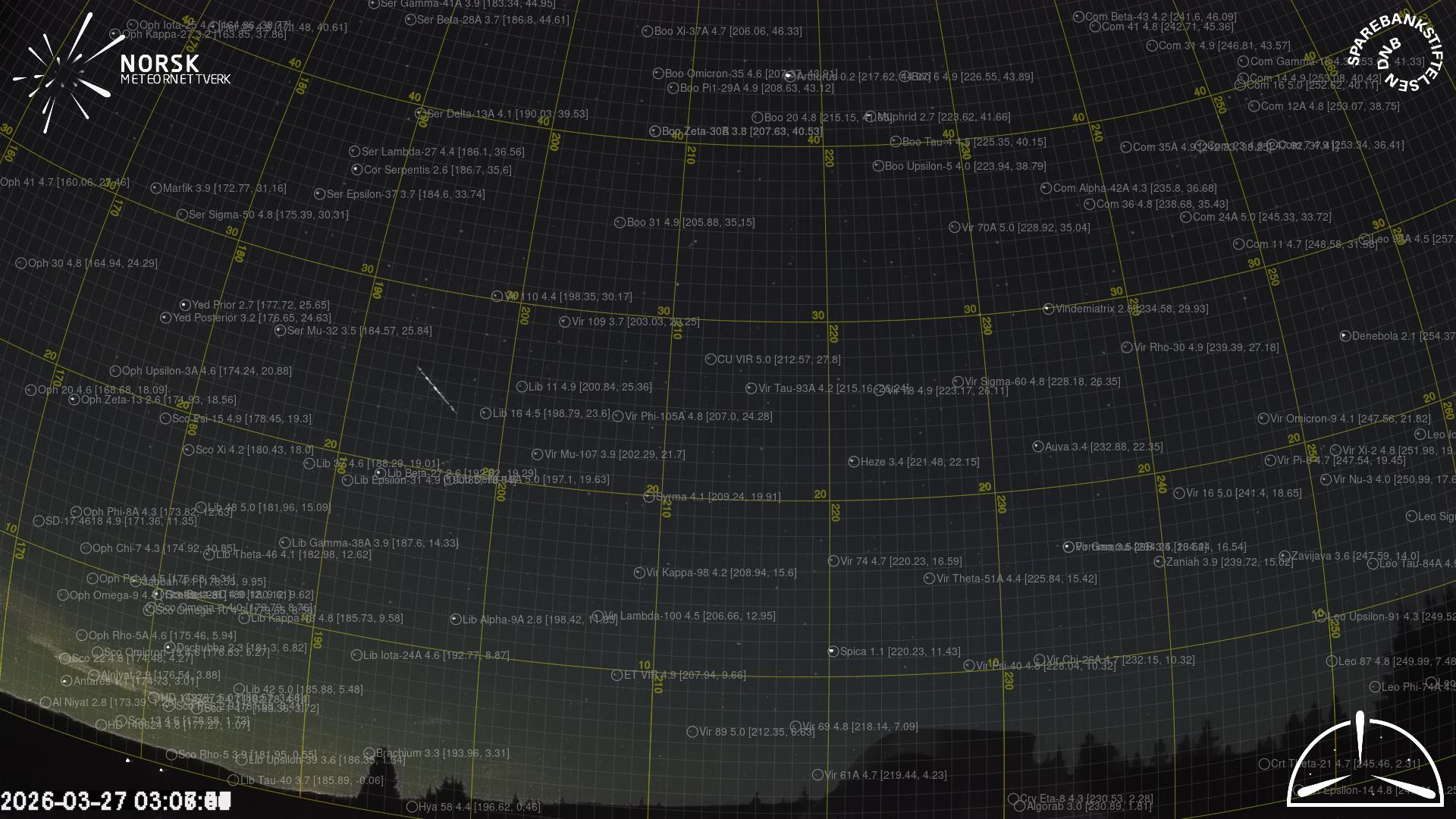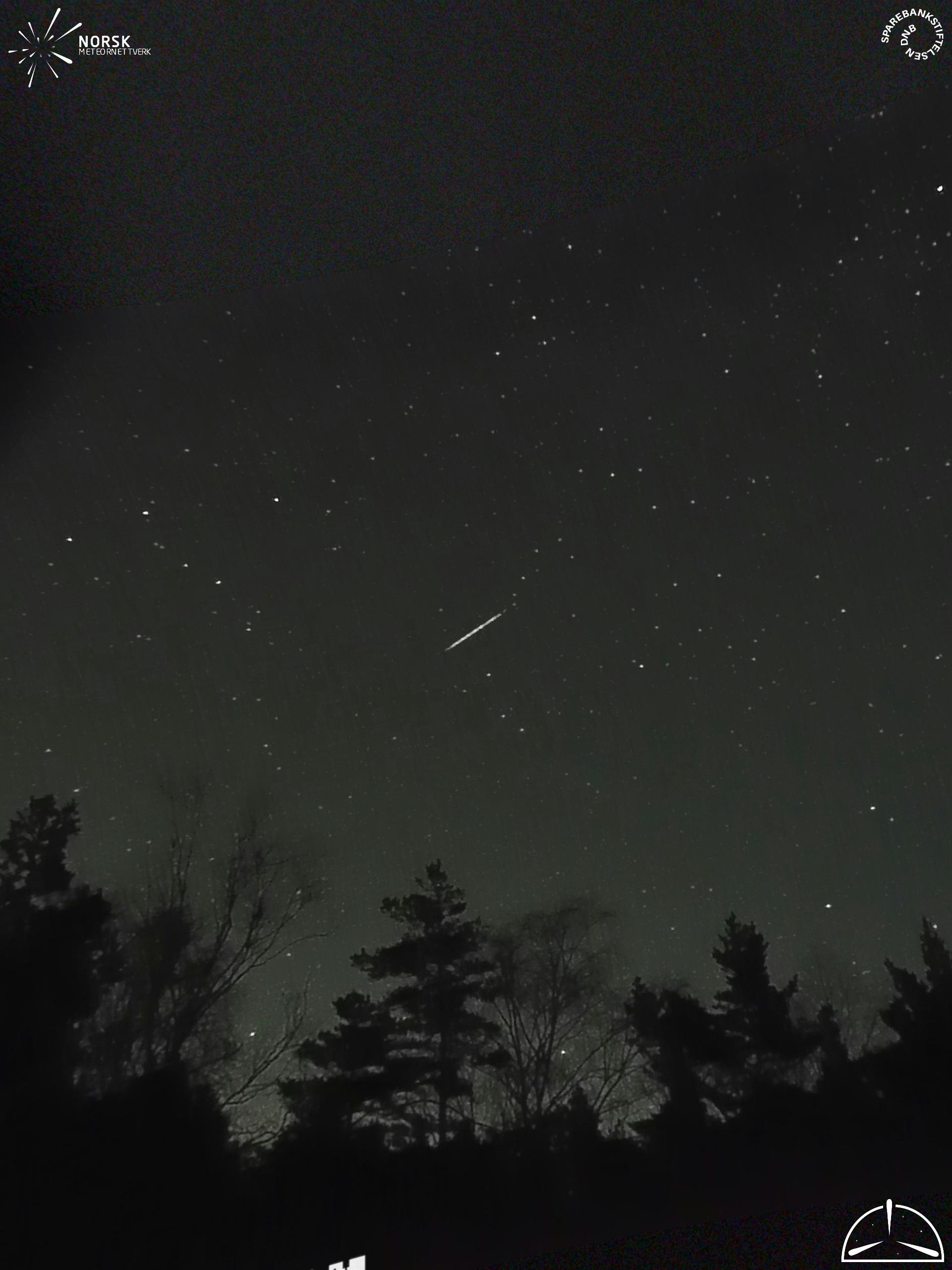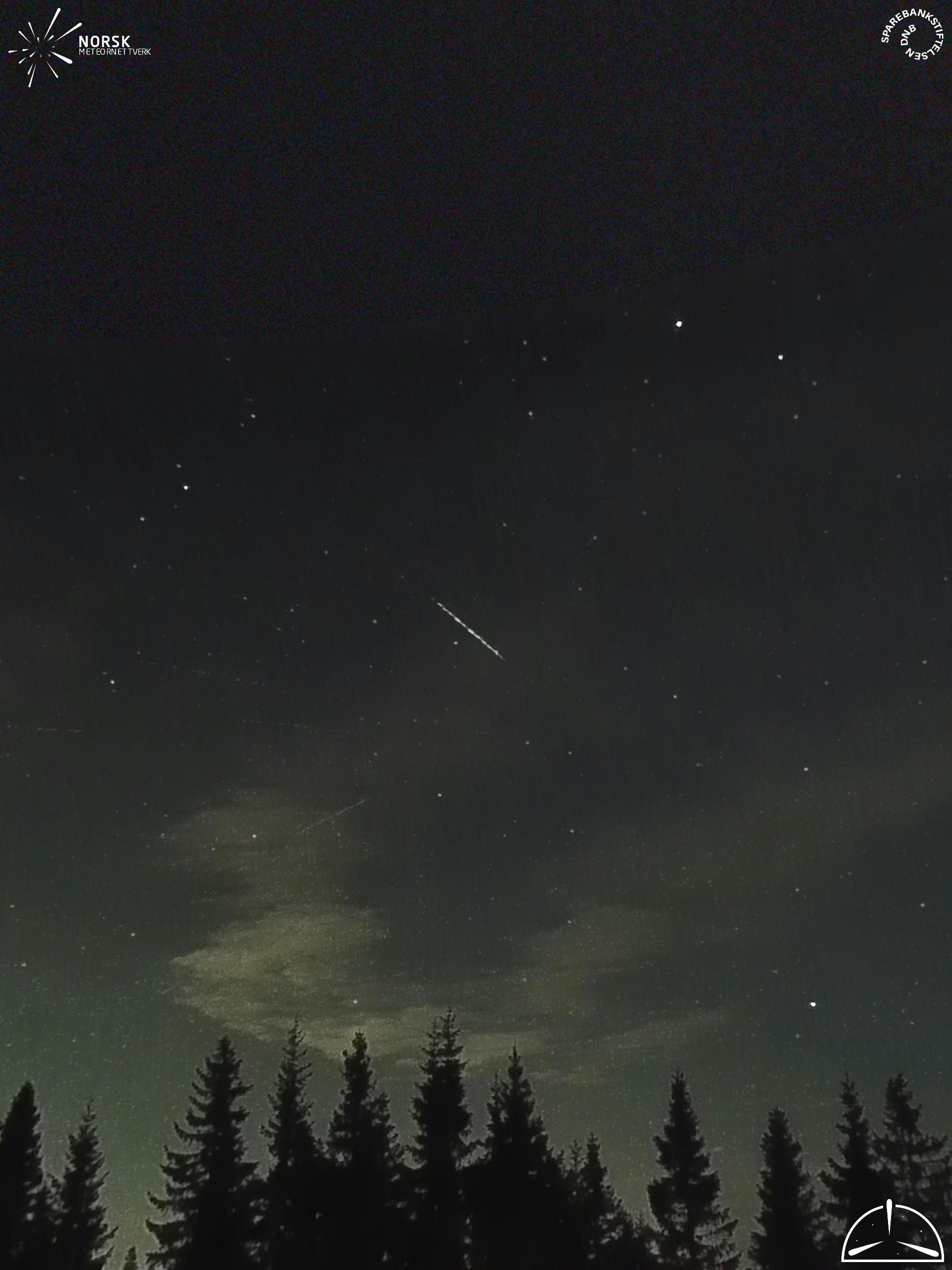 Mapa zobrazuje dráhy meteoru. Světlejší čáry ukazují směry od pozorovacích stanic při objevení se meteoru a tmavší čáry, kde byl naposledy viděn. Modrá šipka značí viditelnou dráhu meteoru.